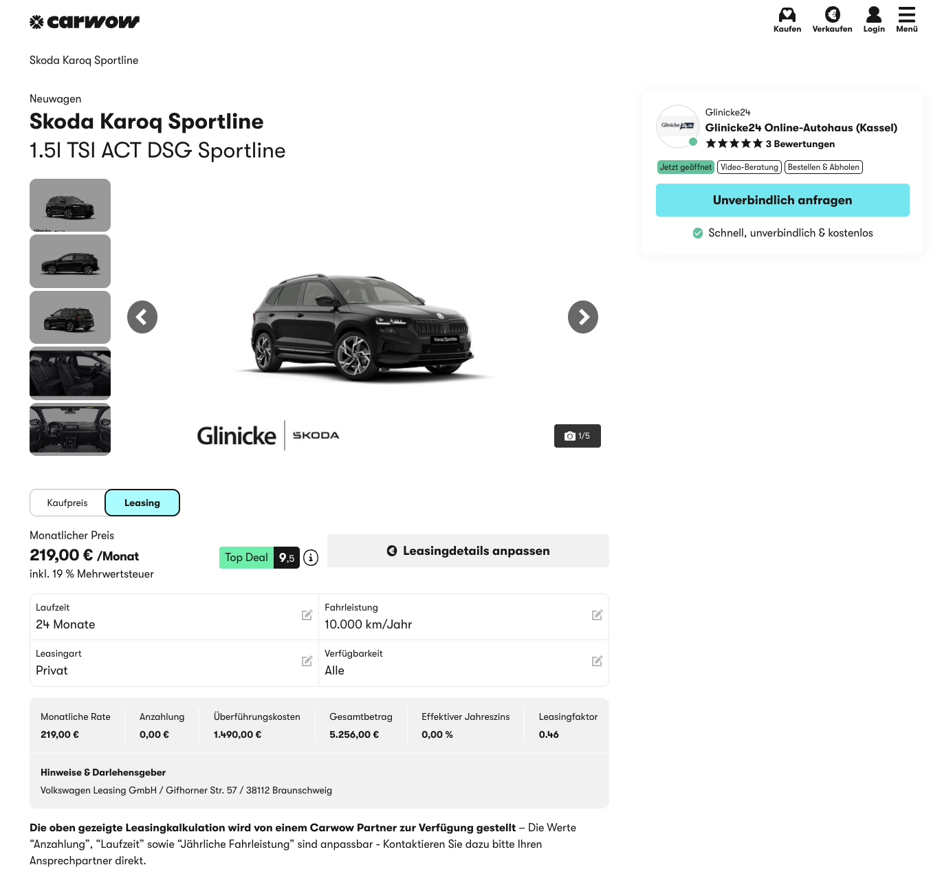 Kalkuliert ist das Angebot mit 24 Monaten Laufzeit und 10.000 Kilometern pro Jahr, Anpassungen sind meist möglich. Der Preisvorteil wird im Vergleich besonders deutlich, denn beim Marktführer liegt der Karoq aktuell bei rund 392 Euro brutto pro Monat. Damit steht die carwow Rate spürbar günstiger im Raum, ohne dass beim Motor, beim DSG oder bei der Sportline Ausrichtung Abstriche nötig sind.