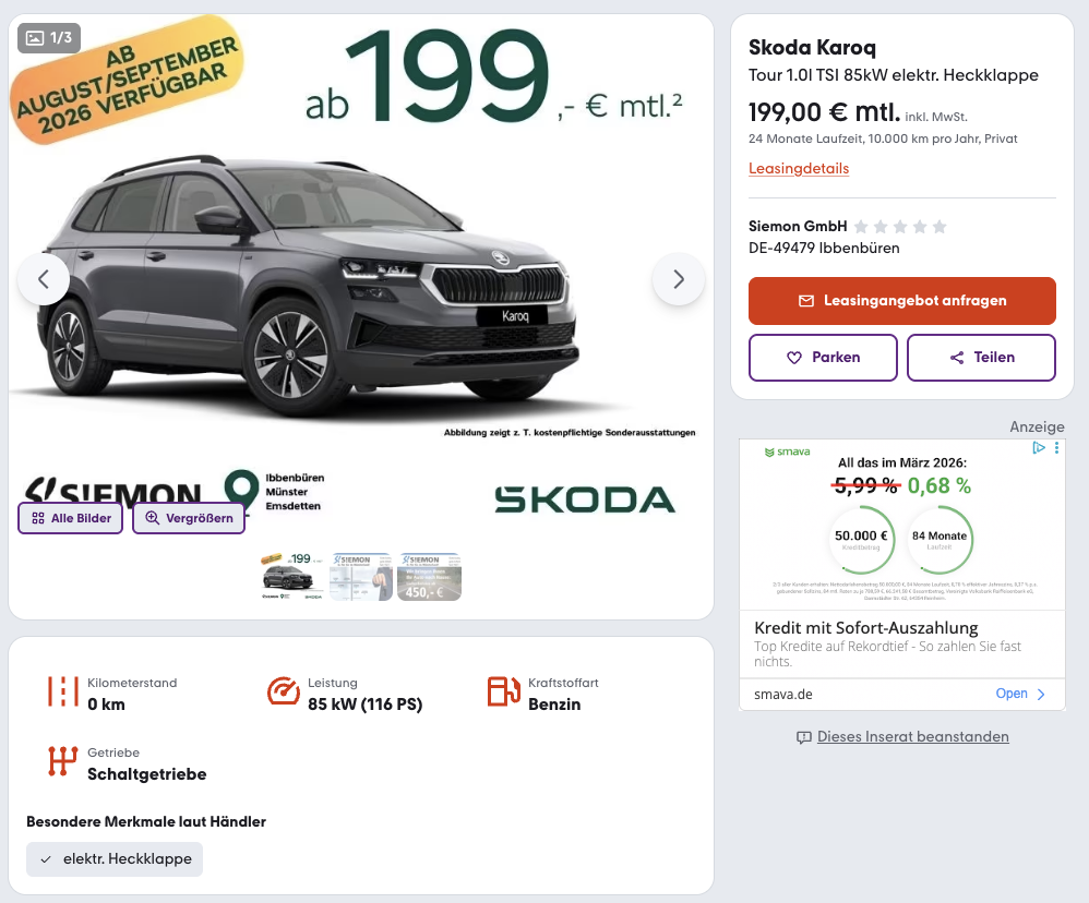 Kompakt-SUV mit starkem Preis-Leistungs-Verhältnis. Sichert euch den Škoda Karoq 1.0 TSI 85 kW Tour bei mobile.de für nur 199 Euro im Monat pro brutto im Leasing. Es handelt sich um ein frei konfigurierbares Bestellfahrzeug mit einer Lieferzeit von rund sechs Monaten. Damit lässt sich das Fahrzeug individuell zusammenstellen, während die monatliche Rate im Segment attraktiv bleibt.