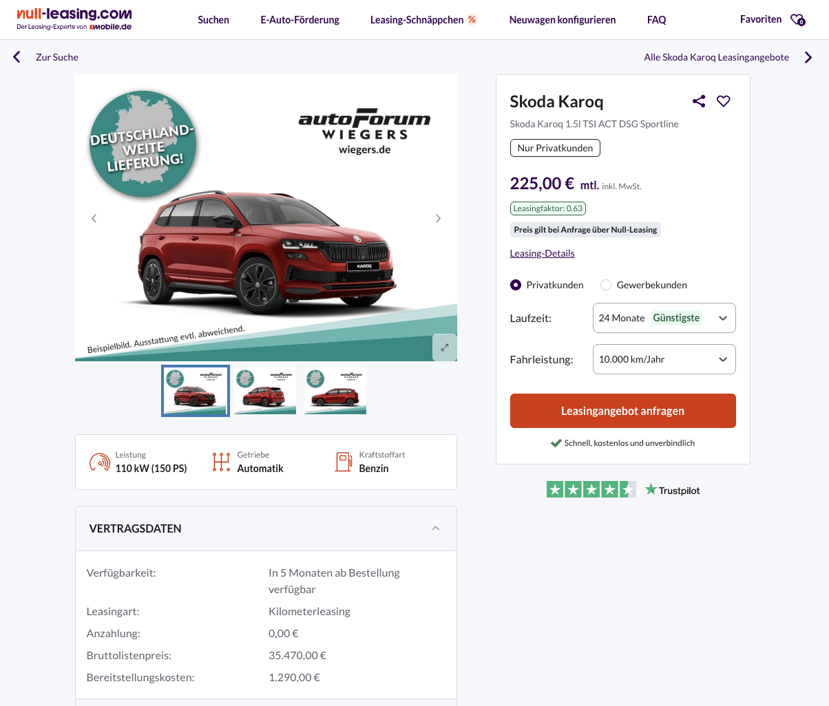 Der Škoda Karoq gehört seit Jahren zu den festen Größen im Kompakt-SUV-Segment. Škoda Karoq 1.5 TSI 110 kW DSG Sportline bei Null-Leasing für 225 Euro brutto im Monat bringt den Bestseller jetzt zu besonders attraktiven Konditionen auf die Straße. Das Angebot gilt für Privatkunden und basiert auf einem Bestellfahrzeug mit rund fünf Monaten Lieferzeit.