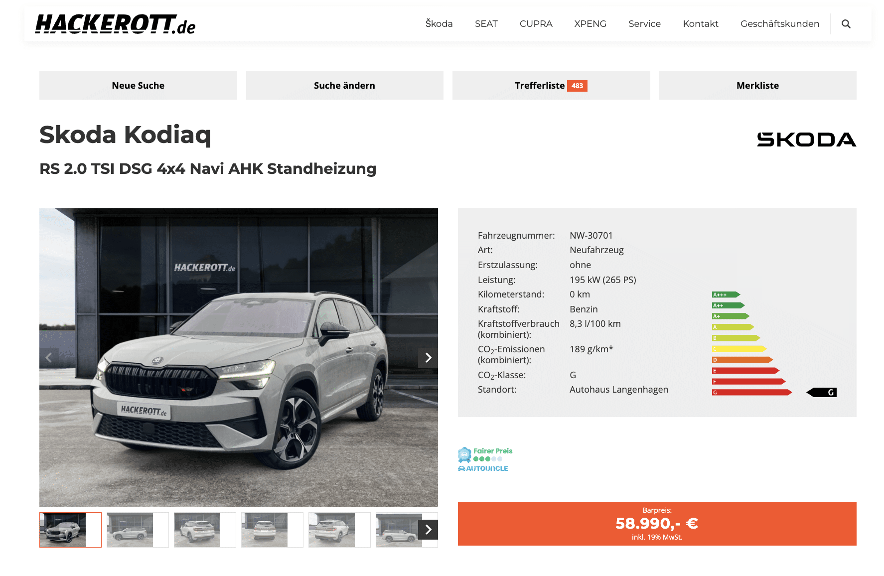Ein Familien-SUV mit sportlicher Attitüde. Hackerott bietet den Škoda Kodiaq 2.0 TSI 195 kW DSG 4×4 RS als sofort verfügbaren Lagerwagen für 58.990 Euro brutto an, lackiert in Graphite-Grau Metallic. Keine Konfigurationslotterie, keine lange Pipeline, ihr steigt in ein Topmodell ein, das Performance mit Komfort zusammenführt und im Alltag genauso überzeugt wie auf der langen Strecke.