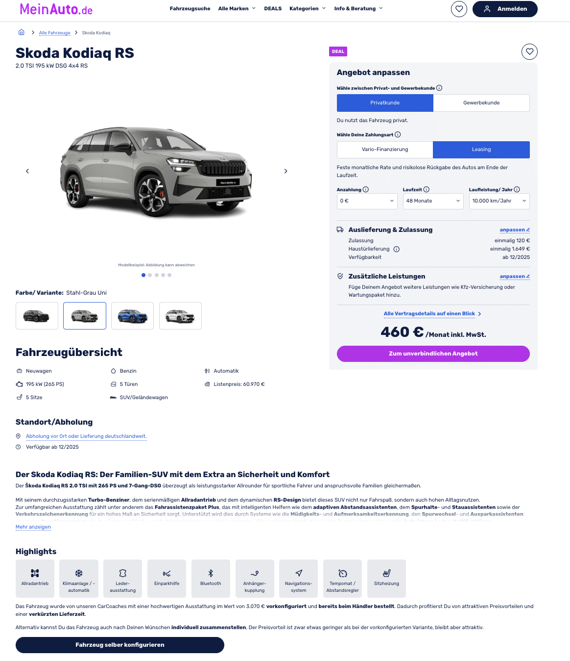 Dieses SUV zeigt seine Muskeln! Bei MeinAuto steht der Škoda Kodiaq 2.0 TSI 195 kW DSG 4×4 RS aktuell für 460 Euro brutto im Monat im Leasing bereit. Das Fahrzeug ist bereits bestellt und soll noch im Dezember 2025 ausgeliefert werden. Ein echtes Highlight für alle, die Fahrspaß und Platz in einem Paket suchen. Zur Auswahl stehen exklusive Farben wie Black Magic Perleffekt, Stahl Grau Uni und Race Blau Metallic – jeder Ton ein Statement.