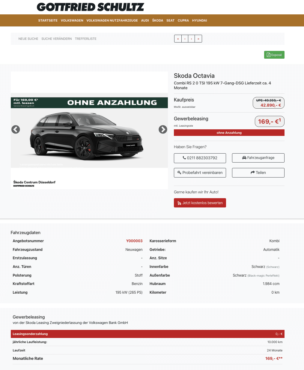 Bei Gottfried-Schultz bekommt ihr den Škoda Octavia Combi RS 2.0 TSI DSG als frei konfigurierbares Bestellfahrzeug für nur 169 Euro netto im Monat. Die Eckdaten sind erfreulich klar: Leasingfaktor rund 0,41, 24 Monate, 10.000 km/Jahr, Lieferzeit ca. vier Monate. Lack, Felgen, Sitze, Pakete, ihr stellt euren RS nach Wunsch zusammen und bleibt dennoch in einer Rate, die im Segment Maßstäbe setzt.