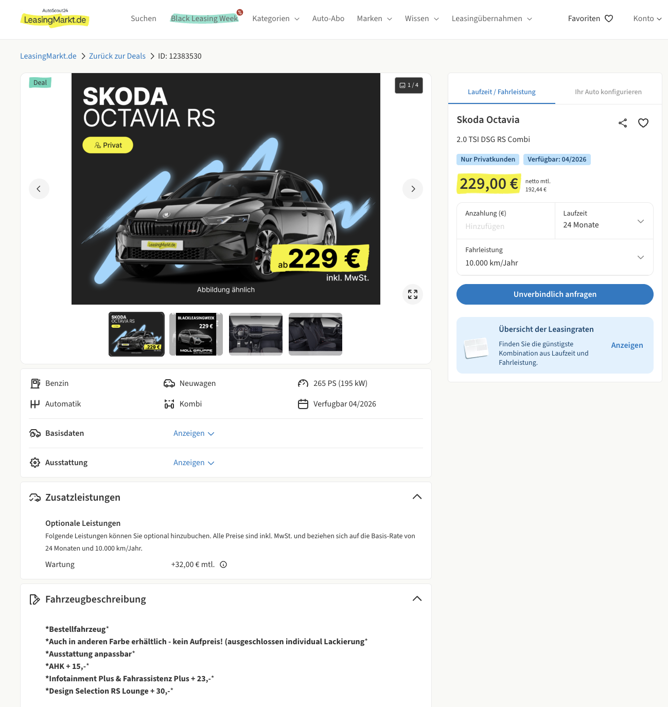 Rasant im Herzen, vernünftig im Alltag, dieser RS-Kombi verbindet Familienalltag mit echter Sportlichkeit. Bei LeasingMarkt gibt es den Škoda Octavia Combi RS 2.0 TSI DSG im Privatleasing für 229 Euro brutto pro Monat, ein frei konfigurierbares Bestellfahrzeug mit Lieferstart ab April 2026. Lack, Räder und Ausstattungspakete wählt ihr nach Geschmack, die Konfiguration bleibt offen für eure Prioritäten bei Optik, Komfort und Technik.