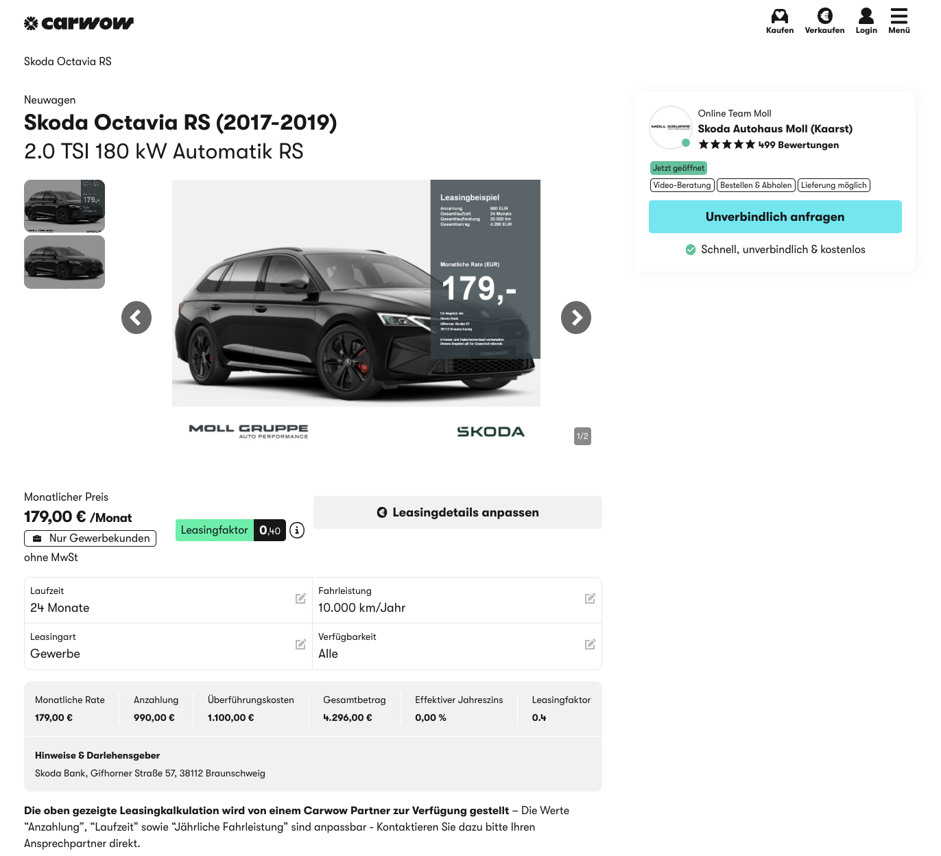 Kalkuliert ist das Angebot auf 24 Monate Laufzeit und 10.000 Kilometer pro Jahr. Der Preisvergleich setzt noch einen drauf. Während der Marktführer für einen vergleichbaren Škoda Octavia Combi RS aktuell rund 359 Euro netto pro Monat aufruft, bei gleicher Anzahlung, liegt dieses Angebot bei 179 Euro netto.