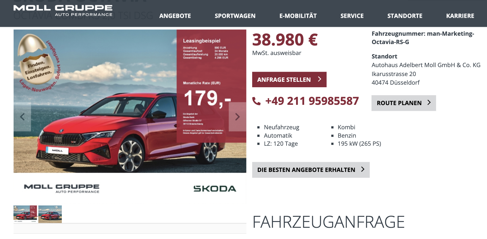Ein Kombi, der mehr kann als nur praktisch sein. Der Škoda Octavia Combi RS 2.0 TSI DSG vom Autohaus Moll für 179 Euro netto im Monat bringt Leistung, Platz und Ausstattung auf ein Niveau, das im aktuellen Markt auffällt. Kalkuliert wurde das Angebot mit einer Anzahlung von 990 Euro, 24 Monaten Laufzeit und einer Gesamtfahrleistung von 20.000 Kilometer. Das Geschäftsleasing basiert auf einem frei konfigurierbaren Bestellfahrzeug mit einer Lieferzeit von rund vier Monaten.