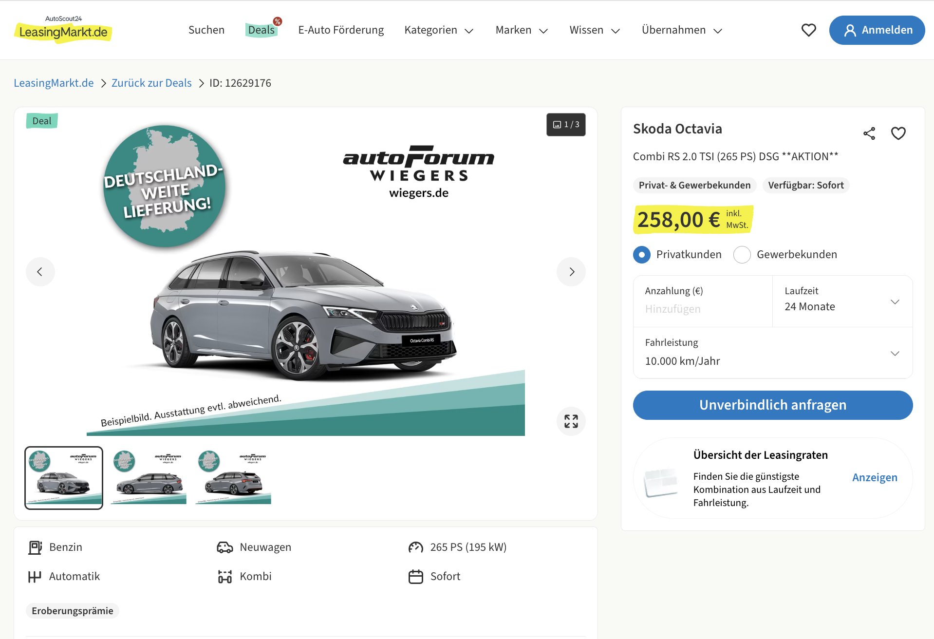Das Angebot umfasst eine Laufzeit von 24 Monaten mit einer flexiblen Kilometerbegrenzung von 10.000 Kilometern pro Jahr. Während andere Anbieter für denselben Octavia RS monatlich über 479 Euro brutto verlangen, spart ihr hier deutlich über 200 Euro pro Monat – ein unschlagbares Angebot in dieser Fahrzeugklasse.