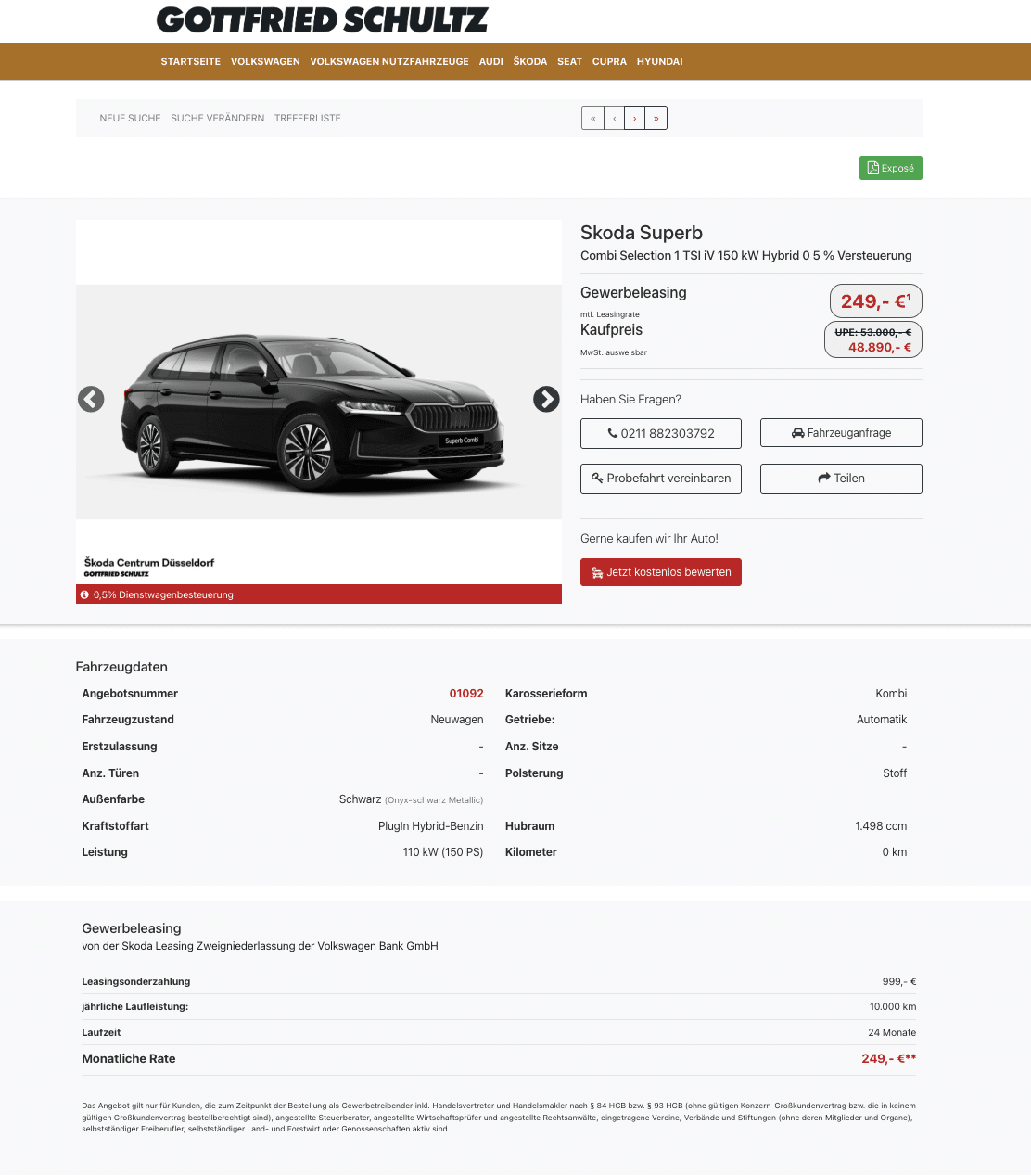 Das Angebot von Gottfried Schultz umfasst 24 Monate Laufzeit bei 10.000 Kilometern pro Jahr. Beim Platzhirsch gibt es den Škoda Superb Combi nur auf Anfrage.