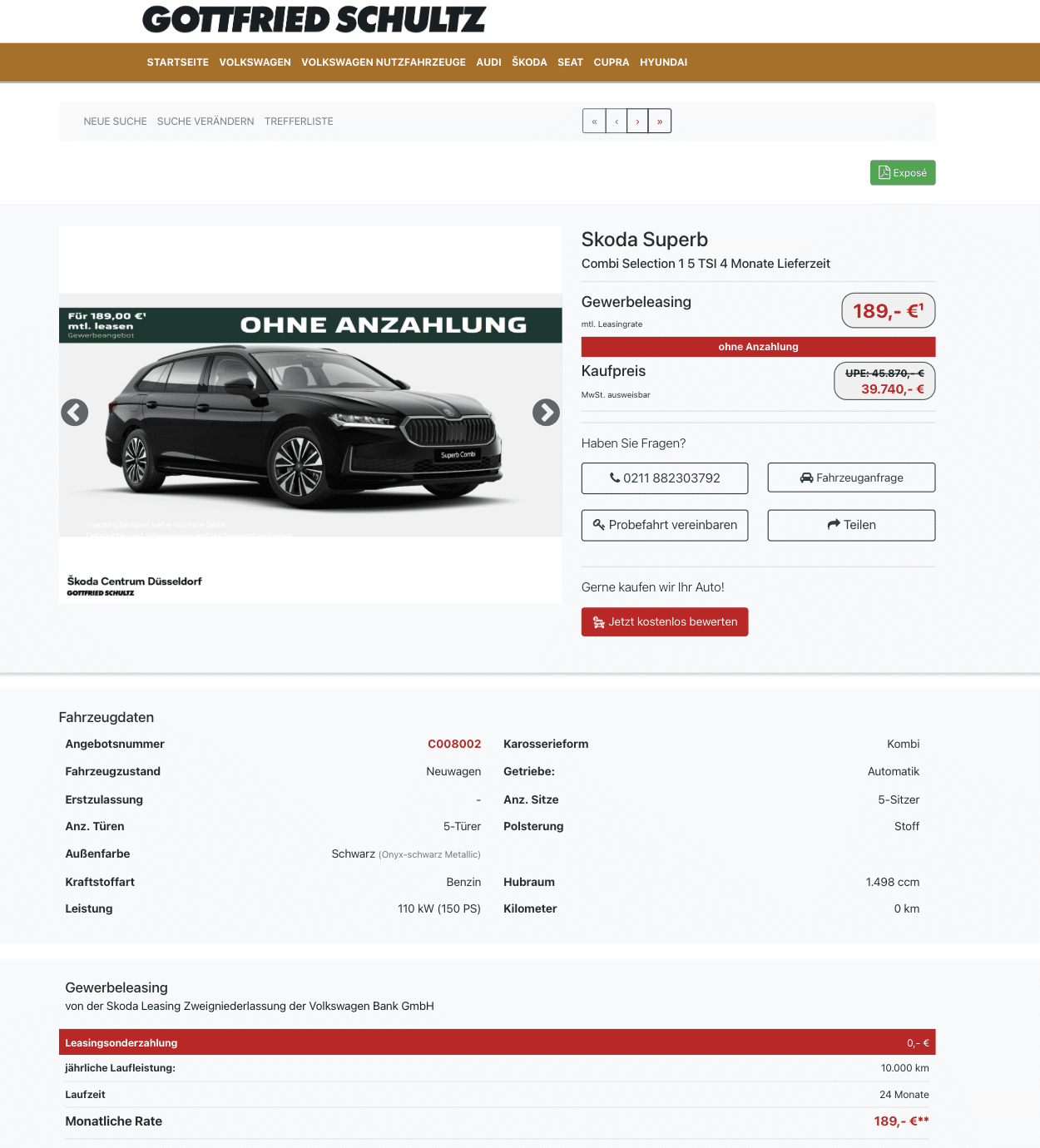 Und der Preisvorteil ist enorm: Während große Wettbewerber für den Škoda Superb Combi aktuell 467 Euro netto im Monat verlangen, liegt das Angebot von Gottfried Schultz bei einem Bruchteil dessen, ein Ersparnis, die Monat für Monat spürbar bleibt.