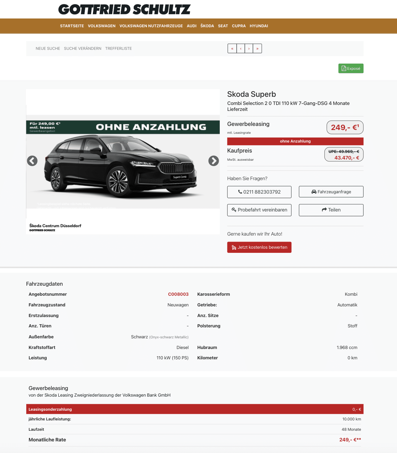 Das Angebot ist auf 48 Monate Laufzeit und 10.000 Kilometer pro Jahr kalkuliert. Mit einem Nettopreis von 249 Euro monatlich ist der Superb Combi nicht nur wirtschaftlich, sondern auch ein echtes Business-Statement. Zum Vergleich: Beim Marktführer werden aktuell 386 Euro netto pro Monat aufgerufen, ein Preisvorteil, der sich sehen lassen kann.