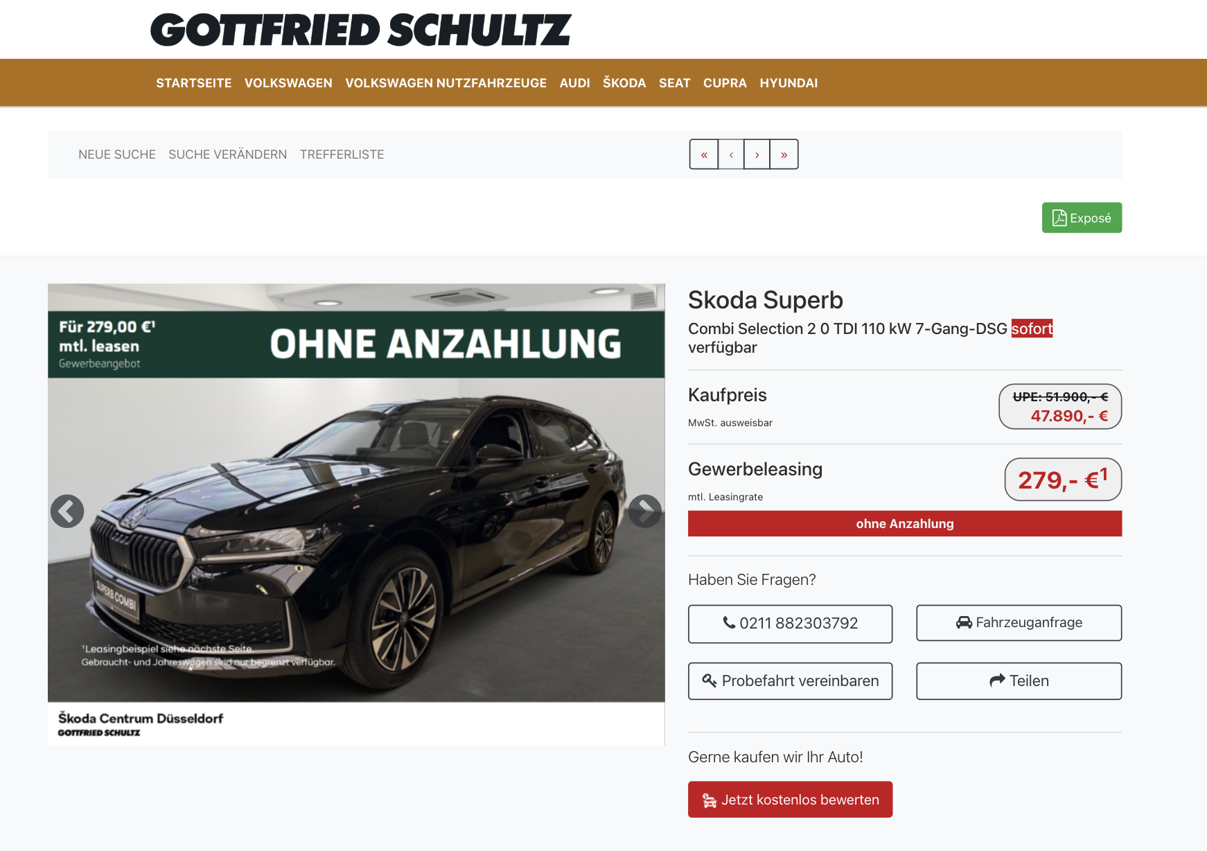Großzügiger Raum, moderne Technik und ein klarer Fokus auf Effizienz, der Škoda Superb Combi gehört seit Jahren zu den festen Größen im Geschäftsleasing. Bei Gottfried Schultz gibt es den Škoda Superb Combi 2.0 TDI DSG Selection aktuell für 279 Euro netto pro Monat. Angeboten wird ein sofort verfügbarer Lagerwagen in Ebony Schwarz Metallic, ein wichtiger Vorteil für alle, die nicht monatelang auf ihr neues Fahrzeug warten möchten. Kalkuliert ist das Angebot auf 48 Monate Laufzeit und 10.000 Kilometer pro Jahr, damit entsteht ein klar planbares Leasingpaket für den beruflichen Alltag.