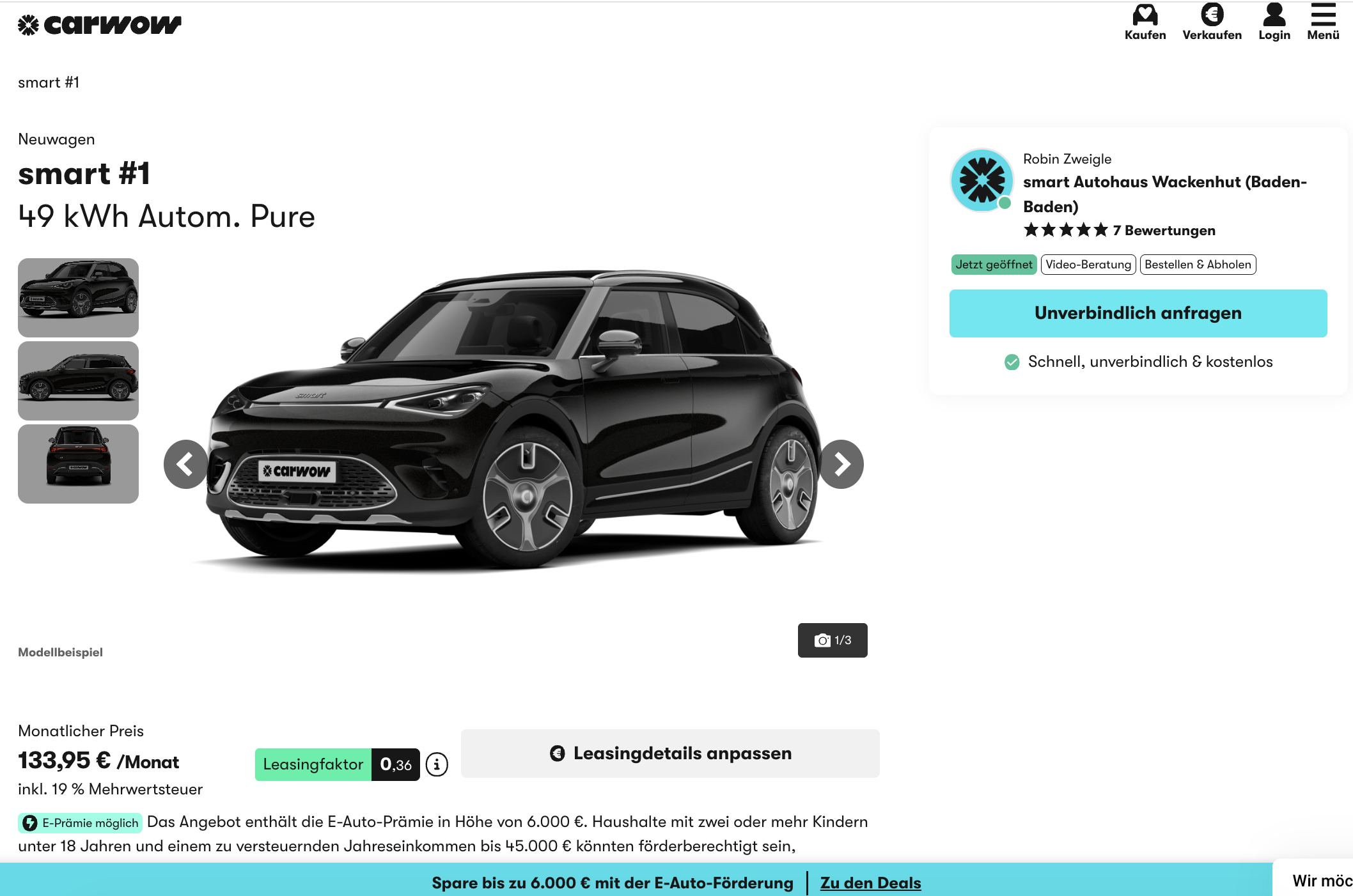 Carwow hat den Smart #1 49 kWh Pure im Angebot! Das elektrische Klein-SUV gibt es hier für nur 133,95 Euro im Monat brutto. Die Rate wird durch eine Anzahlung in Höhe von 6.000 Euro möglich, die ihr euch dank der neuen E-Auto-Prämie im Optimalfall vom Staat zurückholen könnt. Wer nicht oder nur teilweise förderfähig ist, zahlt eine normalisierte Rate von bis zu 300,62 Euro brutto im Monat.