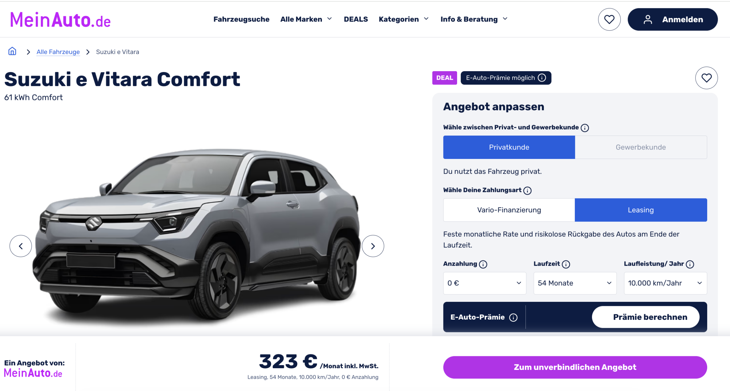 Vorhang auf für den ersten vollelektrischen Suzuki! Den Suzuki e Vitara 61 kWh Comfort gibt es bei MeinAuto.de für 323 Euro brutto pro Monat. Das beste an dem Angebot: Ihr könnt euch die Umweltprämie vom Staat holen, ohne diese als Anzahlung im Voraus leisten zu müssen!