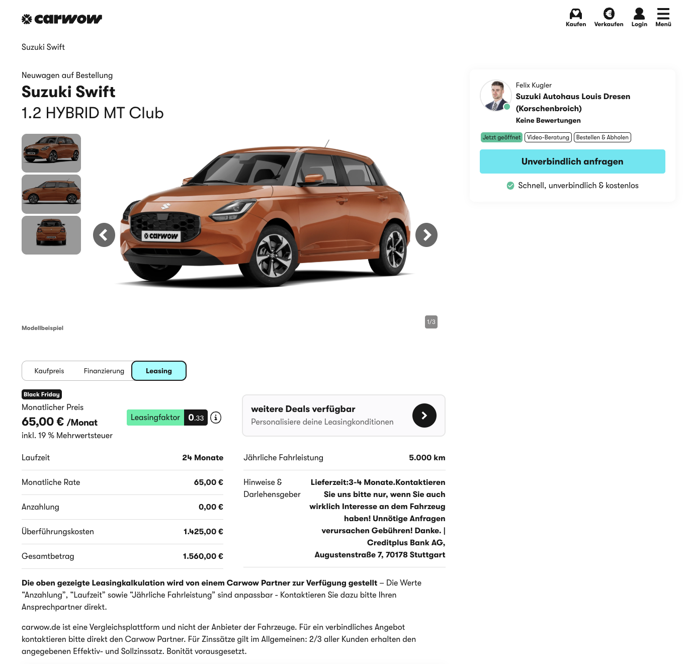 Das Angebot bei carwow basiert auf 24 Monaten und 5.000 Kilometern im Jahr, beides lässt sich anpassen, wenn ihr mehr Fahrleistung braucht. Der Vergleich zeigt die Differenz deutlich, beim Platzhirsch liegt der Suzuki Swift 1.2 Hybrid MT Club bei 183 Euro brutto im Monat, hier startet ihr bei 65 Euro brutto. Für einen voll alltagstauglichen, sparsamen Kleinwagen mit Hybrid Unterstützung, moderner Konnektivität und guter Sicherheitsausstattung ist das ein Argument, das sich schwarz auf weiß in jeder Kalkulation gut macht.