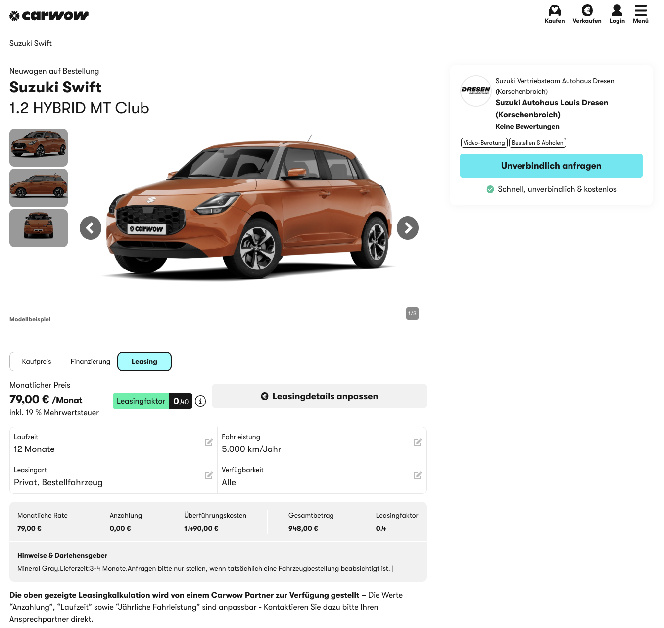 Das Angebot ist auf 24 Monate und 5.000 Kilometer pro Jahr gerechnet, beides lässt sich meist anpassen, wenn das Fahrprofil anders aussieht. Und auch beim Vergleich bleibt der Deal sauber, denn beim Platzhirsch ist der Swift aktuell eher schwer greifbar, oft nur auf Anfrage, ohne klar ausgewiesene Konditionen. Hier steht der Preis im Vordergrund, 79 Euro brutto im Monat bei Leasingfaktor 0,40, dazu freie Konfiguration, das ist die Art Kleinwagen Leasing, die man nicht lange erklären muss, weil sie sich von selbst rechnet.