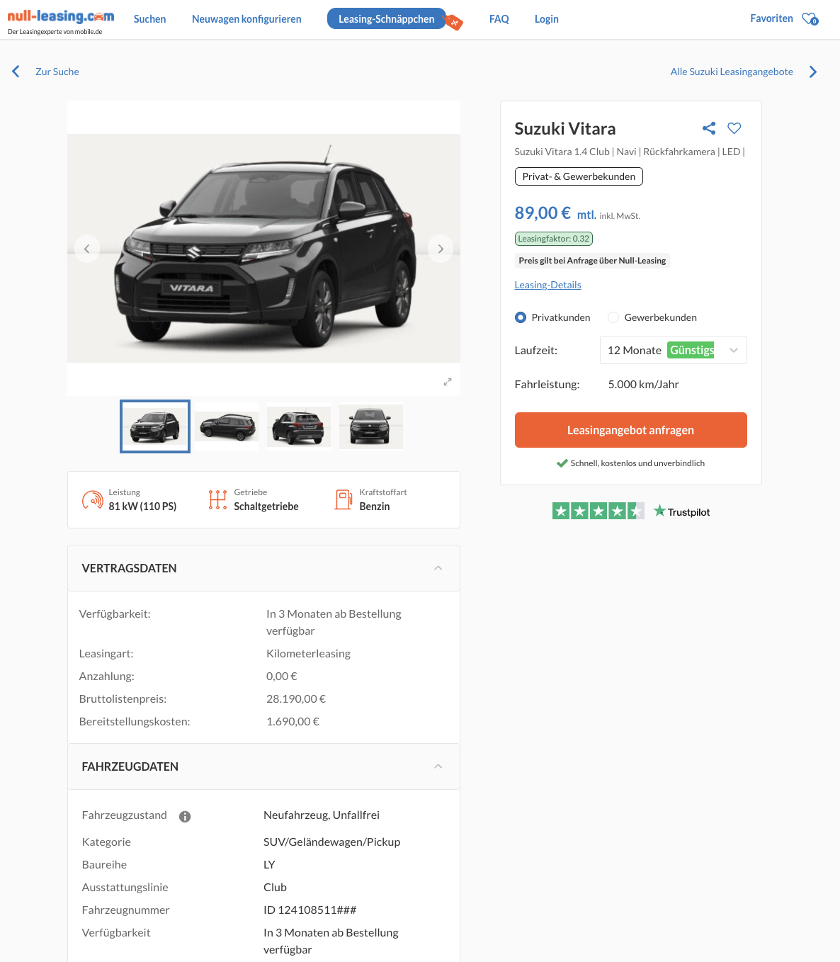 Hier kommt ein SUV für echte Sparfüchse! Den Suzuki Vitara 1.4 Boosterjet Hybrid Club gibt es aktuell bei Null-Leasing für 89 Euro brutto pro Monat, kalkuliert mit 12 Monaten Laufzeit und 5.000 Freikilometer. Dabei handelt es sich um ein frei konfigurierbares Bestellfahrzeug. Ausstattungspakete und Lackierung könnt ihr somit selbst bestimmen. Die Lieferzeit liegt bei rund drei Monaten.