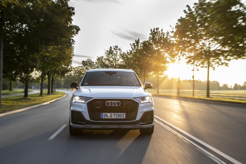 Für den Hybrid-Q7 entschied sich die Marke für den Zusatz „e-tron“. Unter der Karosserie schlummert neben einem Verbrenner auch ein Elektromotor. Der europäische Markt wird mit der Kombination aus Diesel- und Elektromotor versorgt. Im ersten Fall sind es 258 PS (190 kW), im zweiten Fall sind es 128 PS (94 kW). Die Verbindung der beiden Komponenten findet mithilfe einer Kupplung statt. Außerdem stehen dem Fahrer insgesamt drei Modi zur Verfügung. „EV“ kennzeichnet das favorisierte Fahren mit dem Elektromotor. Bei „hybrid“ entscheidet das System selbst über den Antrieb. Bei „battery hold“ wird die noch übrige elektrische Energie aufgespart. Die Lithium-Ionen-Batterie hat Audi unter den Kofferraumboden verfrachtet, sie stellt 17,3 kWh bereit. Eine Folge vom Hybrid-Antrieb ist der kleinere Kofferraum, statt den 890 Litern (die es bei den konventionell angetriebenen Q7-Modellen gibt) sind es „nur“ 650 Liter. Lädt man den Akku an einer leistungsstarken Industriesteckdose auf (7,2 kW um genau zu sein), dann dauert eine volle Ladung in etwa zweieinhalb Stunden. Die maximale Reichweite des Elektroantriebs gibt der Hersteller mit 56 Kilometern an, kombiniert steigt die Zahl auf 940 Kilometer an.