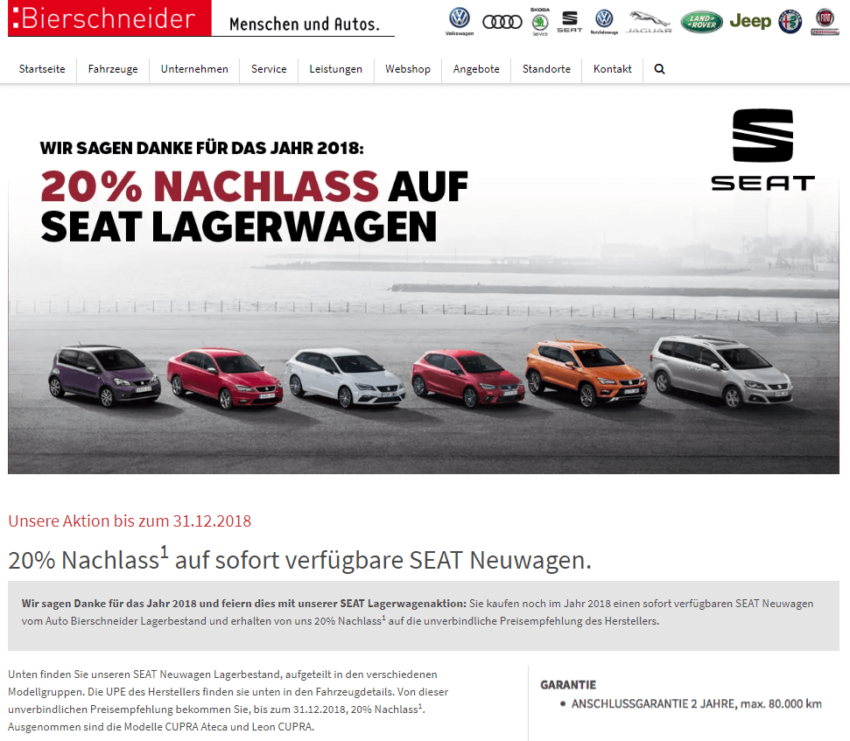 12. Dezember 2018 Kaufdeal: 20% Nachlass auf sofort verfügbare SEAT-Neuwagen bei Bierschneider Auto Bierschneider räumt sein Lager auf und gibt zum Jahresende nochmal satte 20% auf alle sofort verfügbare Lagerfahrzeuge. Es ist für jeden etwas dabei, ob einen... Hitze237°