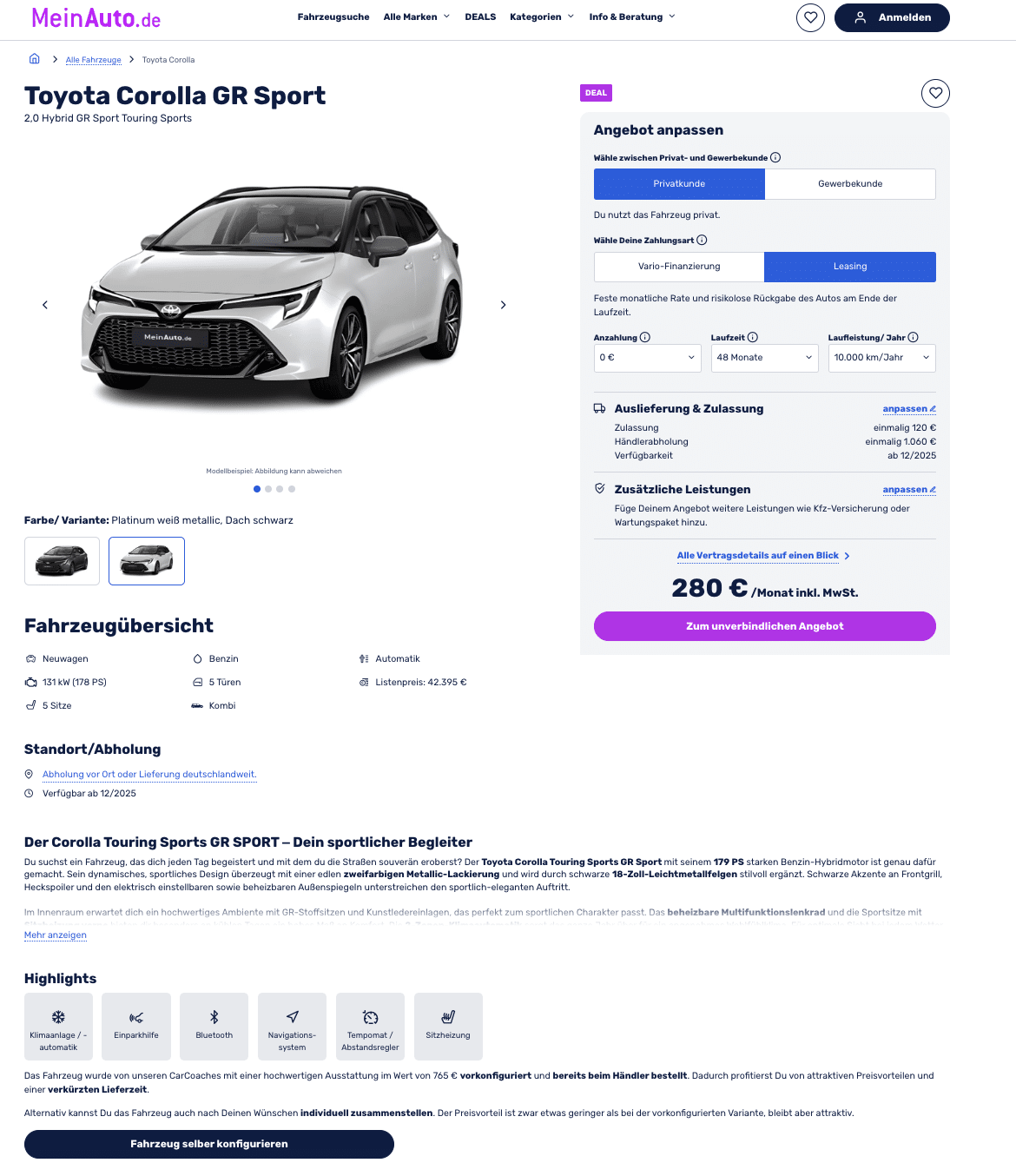 Wer auf der Suche nach einem sportlichen Hybrid-Kombi ist, bekommt bei MeinAuto gerade einen echten Volltreffer. Der Toyota Corolla Touring Sports 2,0 Hybrid GR steht für 280 Euro brutto im Monat im Leasing bereit. Das Fahrzeug ist bereits bestellt und wird ab Dezember 2025 ausgeliefert. Zur Wahl stehen die eleganten Farben Platinum Weiß Metallic und Marlingrau Metallic. Gegenüber dem Marktführer, der satte 359 Euro brutto monatlich verlangt, spart ihr hier spürbar.