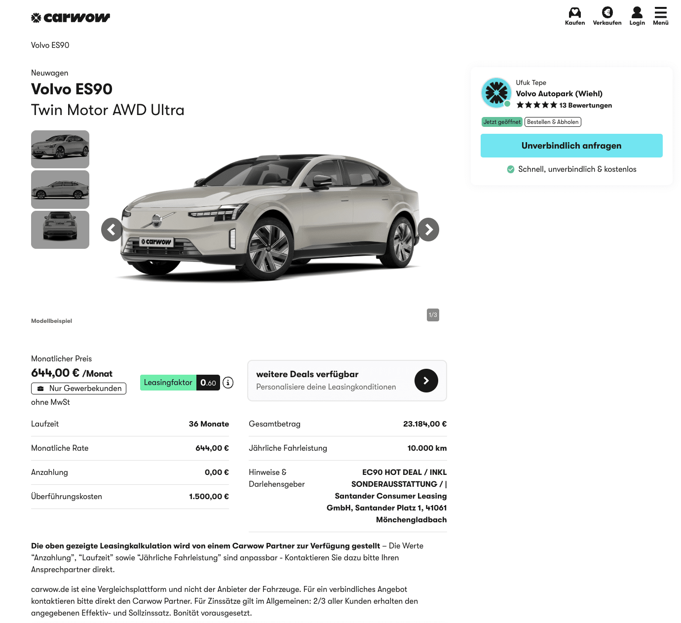 Die Beispielkalkulation bei carwow basiert auf 48 Monaten und 10.000 Kilometern pro Jahr. Im direkten Vergleich zeigt sich der Vorteil deutlich, ein vergleichbares Angebot beim Marktführer läge bei 875 Euro netto monatlich, hier startet ihr bei 644 Euro netto.
