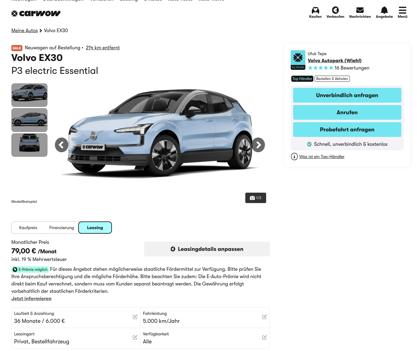 Ein vollelektrischer Volvo fĂŒr unter 100 Euro pro Monat, dank UmweltprĂ€mie. Privatkunden können den Volvo EX30 P3 electric Essential bei carwow fĂŒr nur 79 Euro im Monat brutto leasen, bei Zahlung einer Sonderzahlung von 6.000 Euro, die als UmweltprĂ€mie angesetzt ist. Entscheidend fĂŒr eine realistische Bewertung ist daher die umgerechnete Rate. Daraus ergibt sich eine normalisierte Leasingrate von 246 Euro brutto pro Monat. Wer komplett auf eine Anzahlung verzichten möchte, landet bei 262 Euro brutto monatlich bei gleicher Laufzeit. Angeboten wird ein frei konfigurierbares Bestellfahrzeug mit rund fĂŒnf Monaten Lieferzeit.
