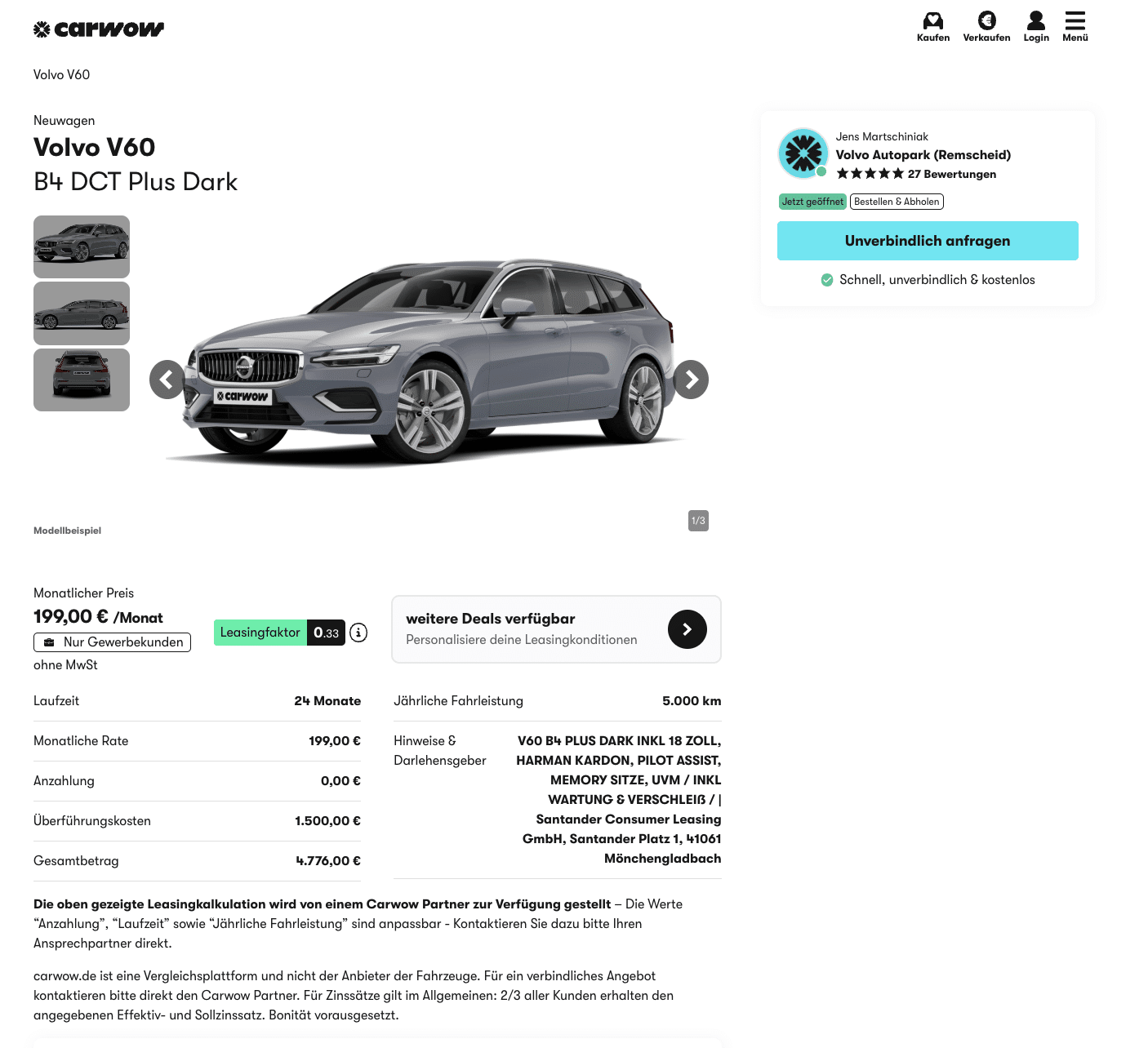 Während der Marktführer für denselben V60 625 Euro netto im Monat verlangt, bleibt man bei carwow mit 199 Euro deutlich darunter.
