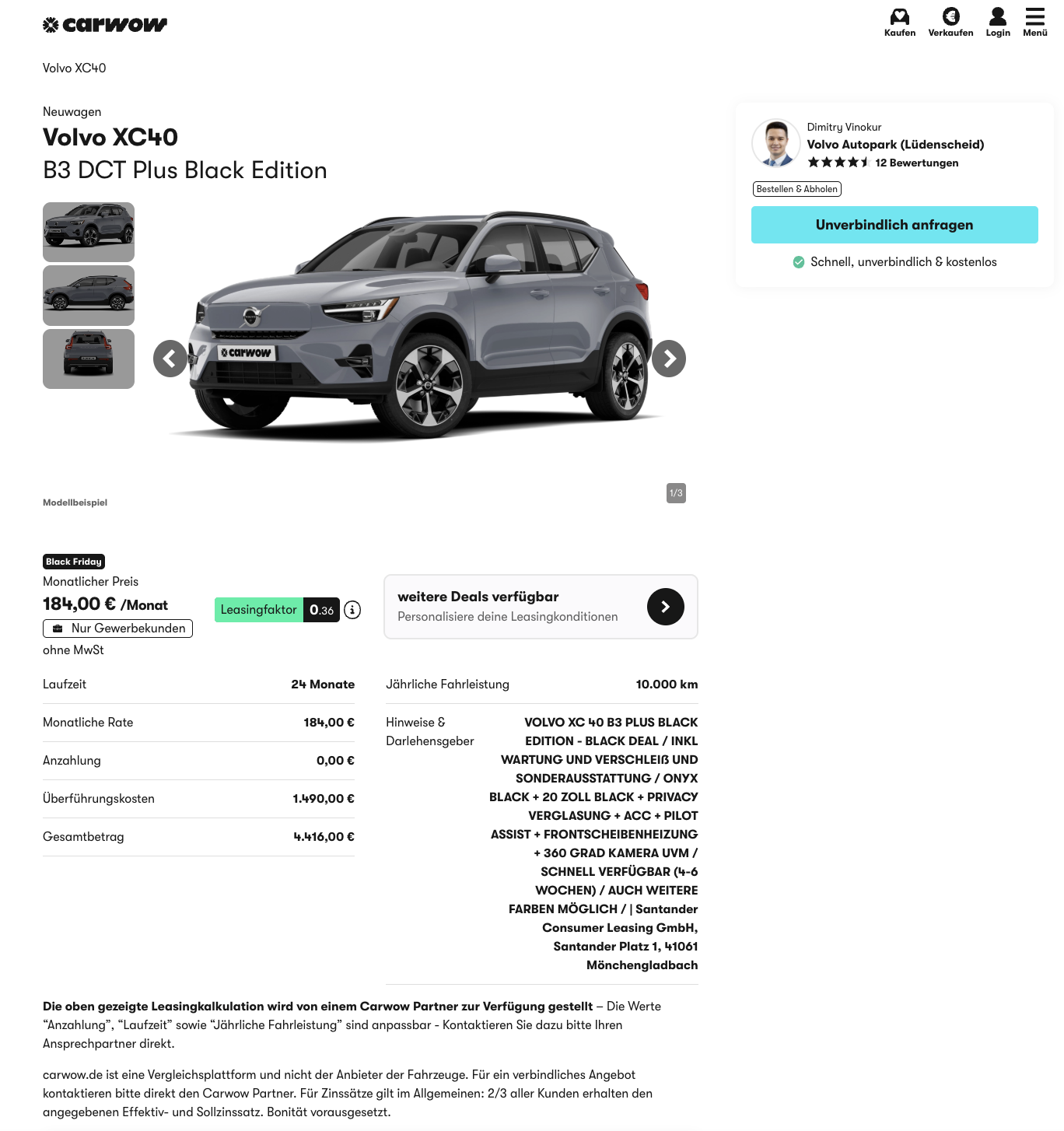 Er ist das kleine Schwarze von Volvo, der Volvo XC40 B3 DCT in der Plus Black Edition. Bei carwow gibt es das Schweden-SUV aktuell für 184 Euro netto im Monat im Full-Service-Leasing für Geschäftskunden, inklusive Wartung und Verschleiß. Der kompakte Premium-SUV ist bereits bestellt und laut Anbieter in vier bis sechs Wochen verfügbar, also keine langen Wartezeiten, sondern zügiger Start in Onyx Black Metallic.
