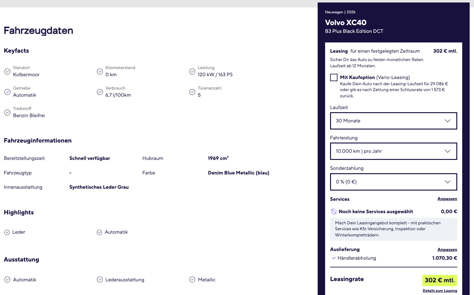 Skandinavischer Stil trifft attraktive Leasingrate, der XC40 ist seit Jahren eines der beliebtesten Premium-SUV im Kompaktsegment. Volvo XC40 B3 Plus Black Edition DCT bei Allane für 302 Euro brutto im Monat bringt genau diese Mischung aus Design, Komfort und moderner Technik zu einer Rate auf die Straße, die im aktuellen Marktumfeld durchaus interessant wirkt. Das Angebot richtet sich sowohl an Privat– als auch Geschäftskunden und hat einen praktischen Vorteil, der im Leasingmarkt nicht selbstverständlich ist. Das Fahrzeug ist schnell verfügbar und steht in Denim Blue Metallic bereit, kombiniert mit einer grauen Kunstlederausstattung, die dem Innenraum eine hochwertige, zugleich pflegeleichte Anmutung verleiht.