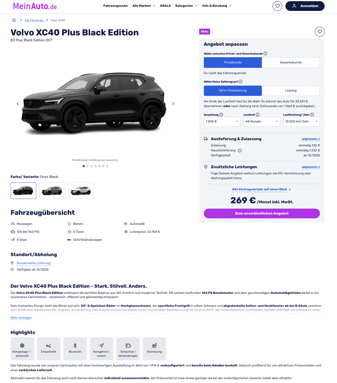 Der Volvo XC40 B3 DCT Plus Black Edition verbindet skandinavische Coolness mit einem Leasingpaket, das sich sehen lassen kann. Bei MeinAuto fahrt ihr ihn im Vario-Leasing für 269 Euro brutto pro Monat, bei einer Anzahlung von 1.000 € Anzahlung. Am Laufzeitende habt ihr die Wahl: übernehmen für 25.531 Euro oder zurückgeben; dafür ist lediglich eine Schlussrate von 1.563 € fällig. Durch die Sonderzahlung ergibt sich eine normalisierte Monatsrate von 289,83 Euro. Alternativ gibt’s das klassische Leasing für 304 € brutto pro Monat, bei gleicher Anzahlung. Die Überführungskosten beinhalten bereits Zulassung und Haustürlieferung, smart gelöst. Der Wagen ist bereits bestellt und ab Dezember 2025 verfügbar; farblich wählt ihr zwischen Onyx Black, Vapour Grey oder Crystal White. An Bord u. a.: 360° Parkkamera (Surround View), Frontscheibenheizung sowie abgedunkelte Seiten-/Heckscheiben ab B-Säule.