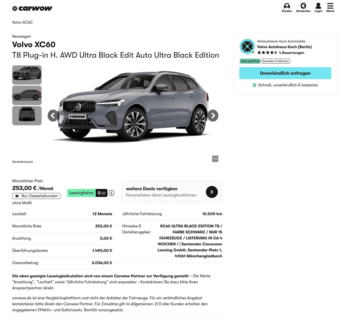 Und der Preisvorteil ist enorm: Während der Marktführer für dasselbe Modell stolze 1.496 Euro netto monatlich verlangt, gibt es den XC60 T8 bei carwow schon für 253 Euro netto, ein Unterschied, der sich sehen und spüren lässt.