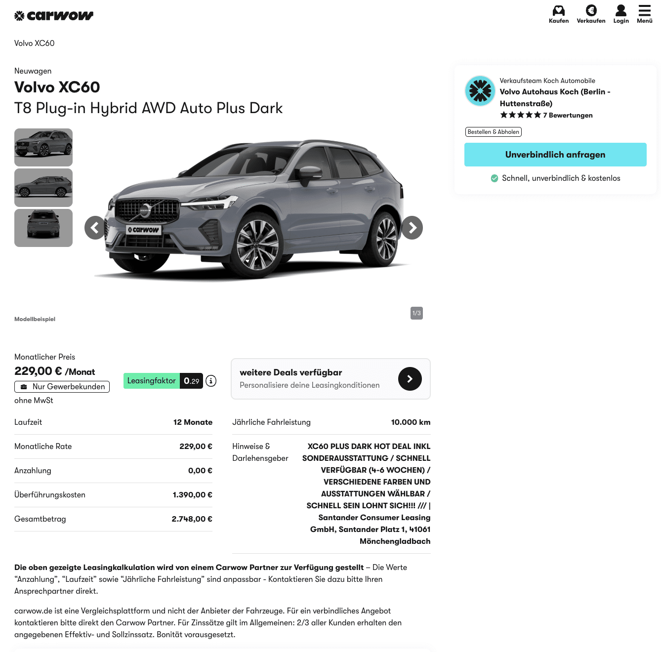 Der Preisvorteil ist enorm. Der Marktführer verlangt 1.500 Euro netto pro Monat für den Volvo XC60 T8 AWD Plus Dark, bei carwow startet der Volvo XC60 Plug-in-Hybrid bereits bei 229 Euro netto pro Monat.