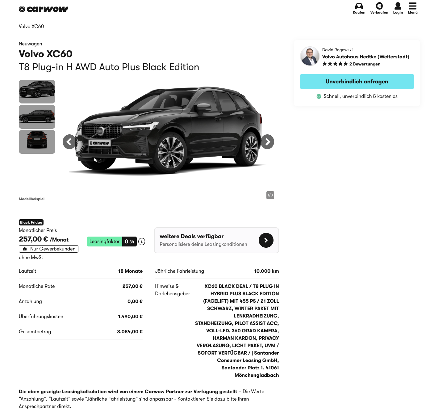 Das Angebot bei carwow ist mit 18 Monaten Laufzeit und 10.000 Kilometern pro Jahr kalkuliert. Beim Platzhirsch wĂĽrde der Volvo XC60 T8 monatlich 1.011 Euro netto kosten, hier stehen 257 Euro netto im Monat in den Konditionen. Ihr spart also deutlich, im Vergleich zum MarktfĂĽhrer.