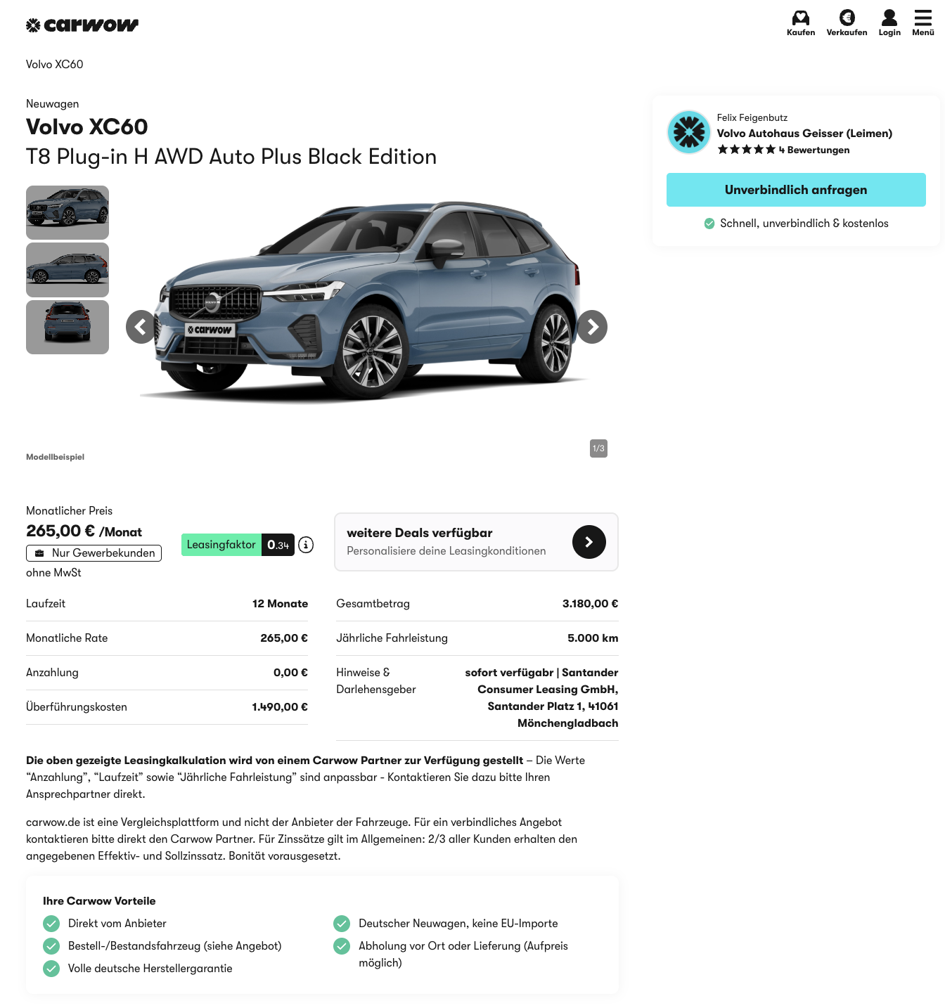 Spannend wird es bei den Zahlen. 265 Euro netto im Monat fĂĽr einen vollwertigen Plug-in-Hybrid SUV dieser Klasse sind im Umfeld eine klare Ansage. Der Blick zum MarktfĂĽhrer zeigt den Abstand deutlich, dort steht ein vergleichbarer XC60 T8 mit rund 1.402Â Euro netto pro Monat in der Liste. Ăśber die 12 Monate Laufzeit ergibt sich damit ein fĂĽnfstelliger Unterschied, bei identischer Fahrzeugklasse.