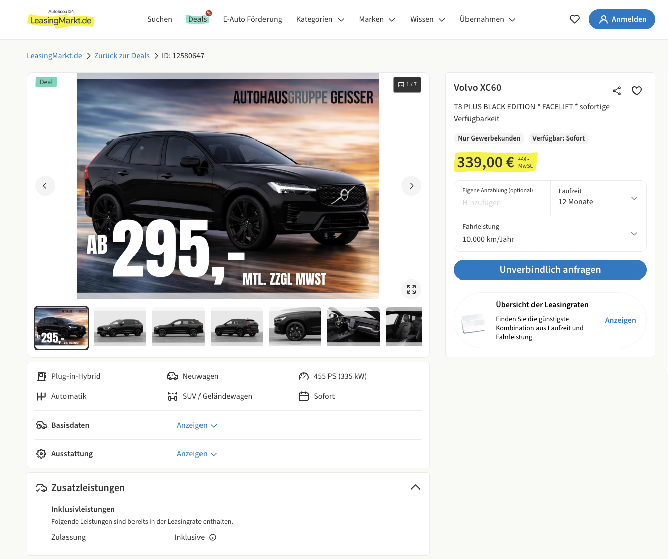 Die Beispielkalkulation basiert auf 12 Monaten Laufzeit und 10.000 Kilometern pro Jahr. Gerade im direkten Marktvergleich fällt das Angebot besonders auf. Während vergleichbare Leasingangebote für den Volvo XC60 T8 Plug-in-Hybrid beim Marktführer derzeit bei rund 1.206 Euro netto pro Monat liegen, bleibt dieses Kurzzeitleasing mit 339 Euro netto deutlich darunter.