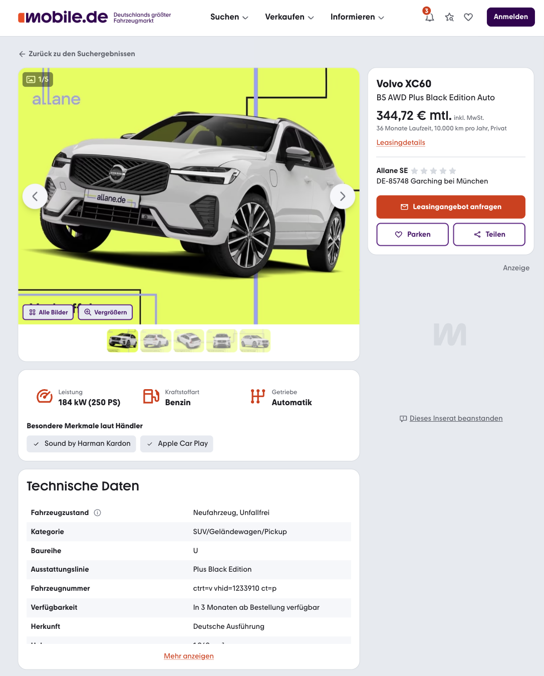 Wer ein hochwertiges SUV fahren will, aber sich trotzdem alle Optionen offenhalten möchte, landet schnell beim Vario-Leasing. Genau hier passt dieses Angebot. Den Volvo XC60 B5 AWD Plus Black Edition gibt es aktuel bei mobile.de für 344,72 Euro brutto im Monat, ein Angebot, das Premium, Flexibilität und Planbarkeit sauber miteinander verbindet. Das Fahrzeug ist bereits bestellt und soll in etwa drei Monaten in der Farbe Crystal White