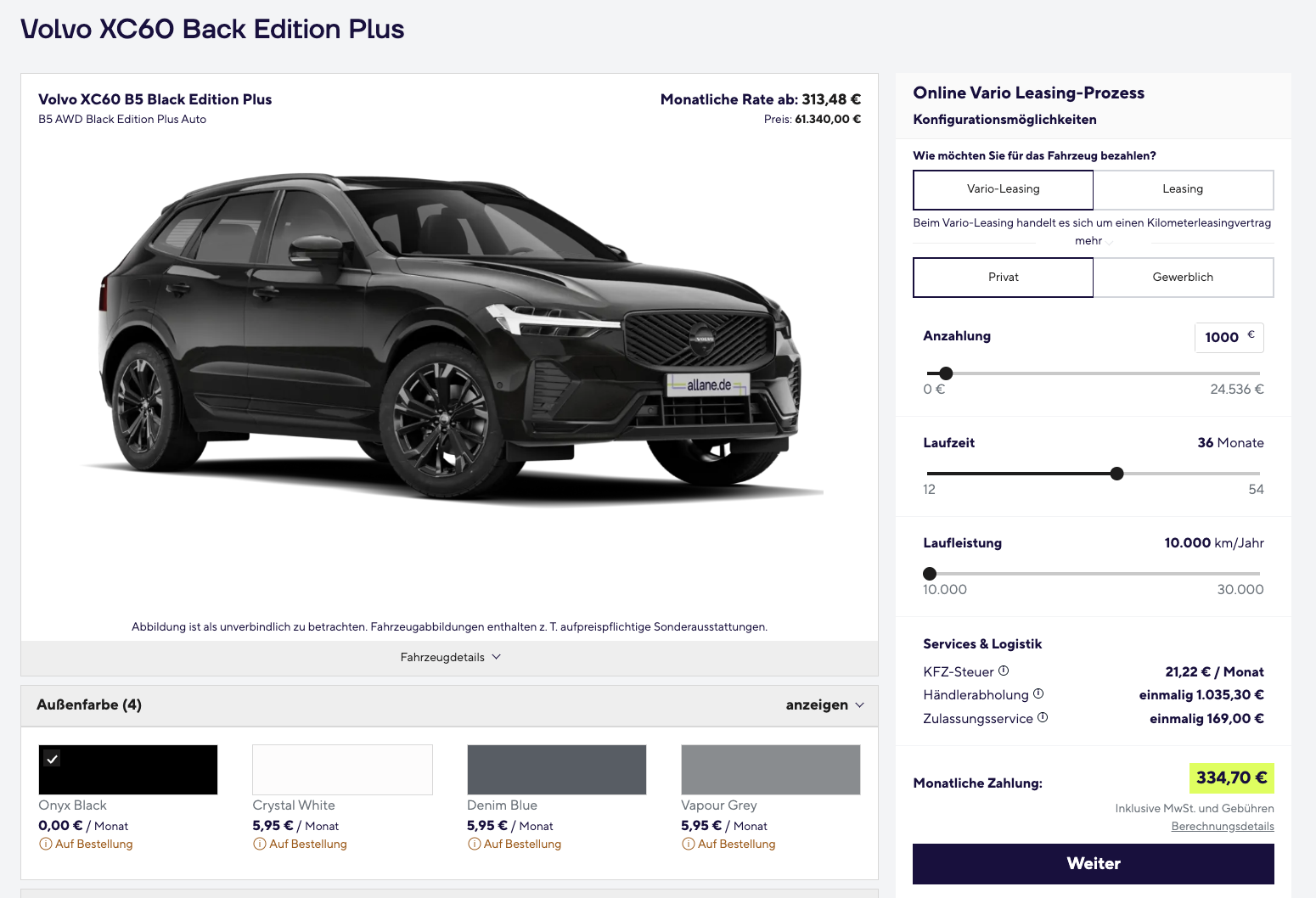 Skandinavisches Design, souveräne Leistung und maximale Flexibilität im Leasing, genau diese Mischung macht den Reiz dieses Volvo-Angebots aus. Der Volvo XC60 B5 AWD Plus Black Edition bei Allane für 334,70 Euro brutto im Monat richtet sich an alle, die ein hochwertiges SUV fahren möchten, ohne sich frühzeitig festzulegen. Die Kalkulation basiert auf 1.000 Euro Anzahlung, das Fahrzeug ist bereits bestellt und soll in rund vier Monaten verfügbar sein, unter anderem in Schwarz, Weiß und Grau.