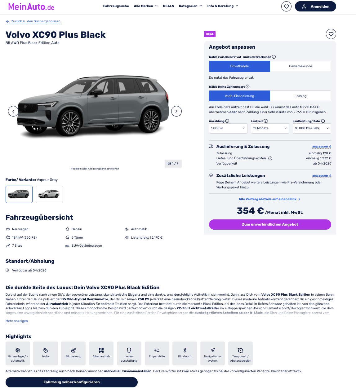 Kalkulert wurde das Angebot mit einer Laufzeit von 12 Monaten und 10.000 Kilometer Laufleistung pro Jahr, beides ist anpassbar. Der Marktvergleich zeigt die Dimension: Der Platzhirsch verlangt für ein vergleichbares Modell über 3.000 Euro brutto pro Monat. Wer Premium fahren will, ohne sich langfristig zu binden, findet hier eines der derzeit spannendsten XC90-Angebote.