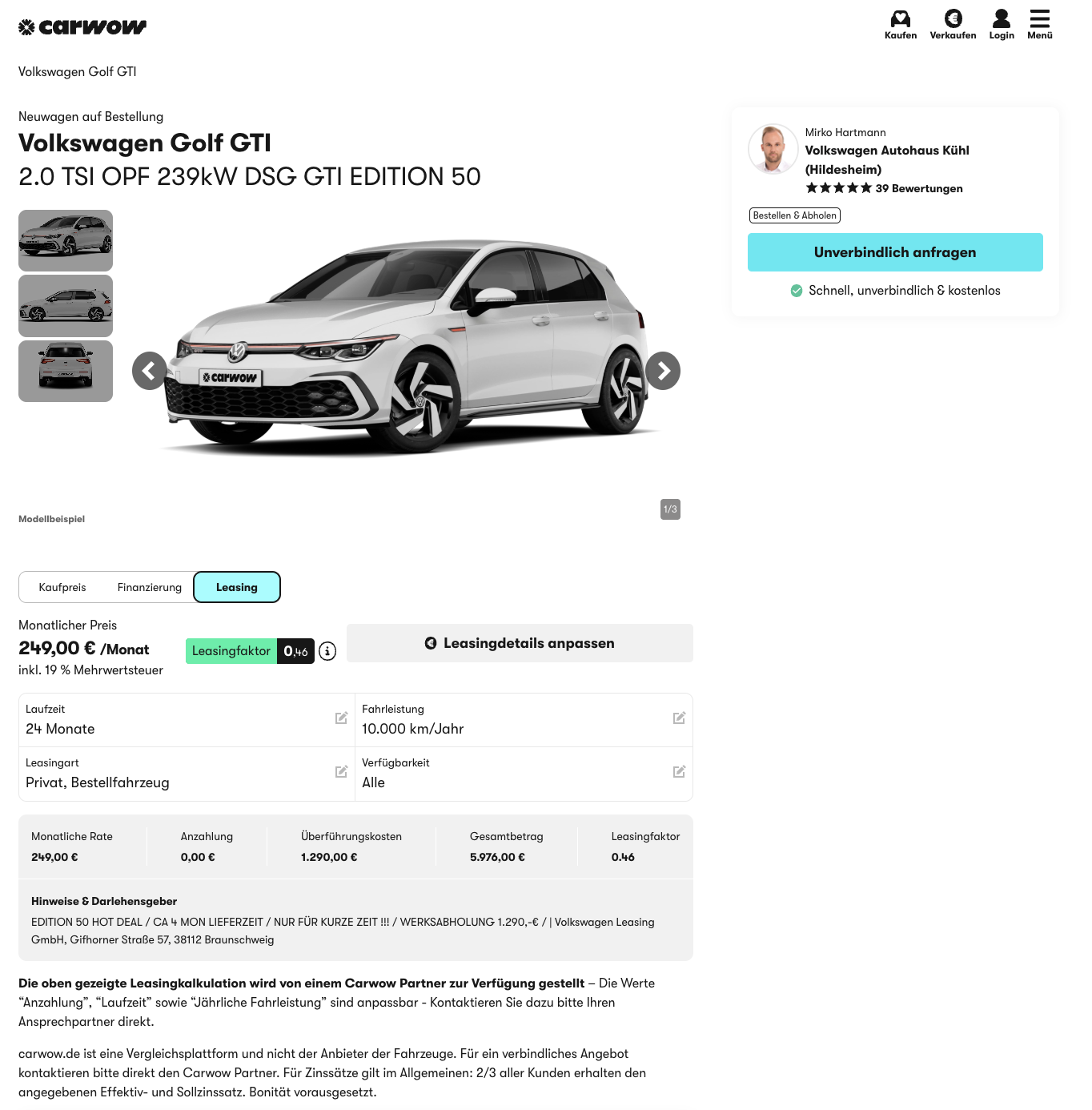 FĂŒnfzig Jahre GTI und ein Angebot, bei dem man schwach werden kann. VW Golf GTI 2.0 TSI Edition 50 bei carwow fĂŒr 249 Euro brutto pro Monat im Privatleasing, alternativ fĂŒr 219 Euro netto im Monat fĂŒr GeschĂ€ftskunden. Dazu kommt, dass es sich um ein frei konfigurierbares Bestellfahrzeug handelt, Farbe, Felgen und Ausstattungspakete lassen sich nach eurem Geschmack zusammenstellen. Die Lieferzeit betrĂ€gt rund vier Monate.