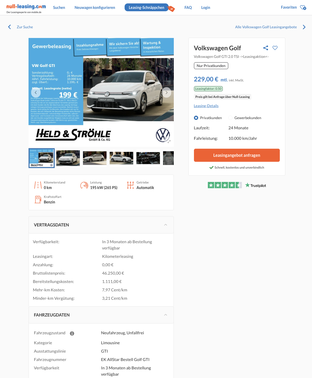 Kalkuliert ist das Angebot auf 24 Monate und 10.000 Kilometer pro Jahr, Anpassungen sind möglich. Der eigentliche Knackpunkt bleibt aber die Rate, denn 229 Euro brutto sind im GTI-Segment extrem niedrig, vor allem im direkten Vergleich zu 746 Euro brutto beim MarktfĂŒhrer. Wer GTI fahren will, bekommt hier nicht nur Emotion, sondern eine Rechnung, die erstaunlich gut aussieht.