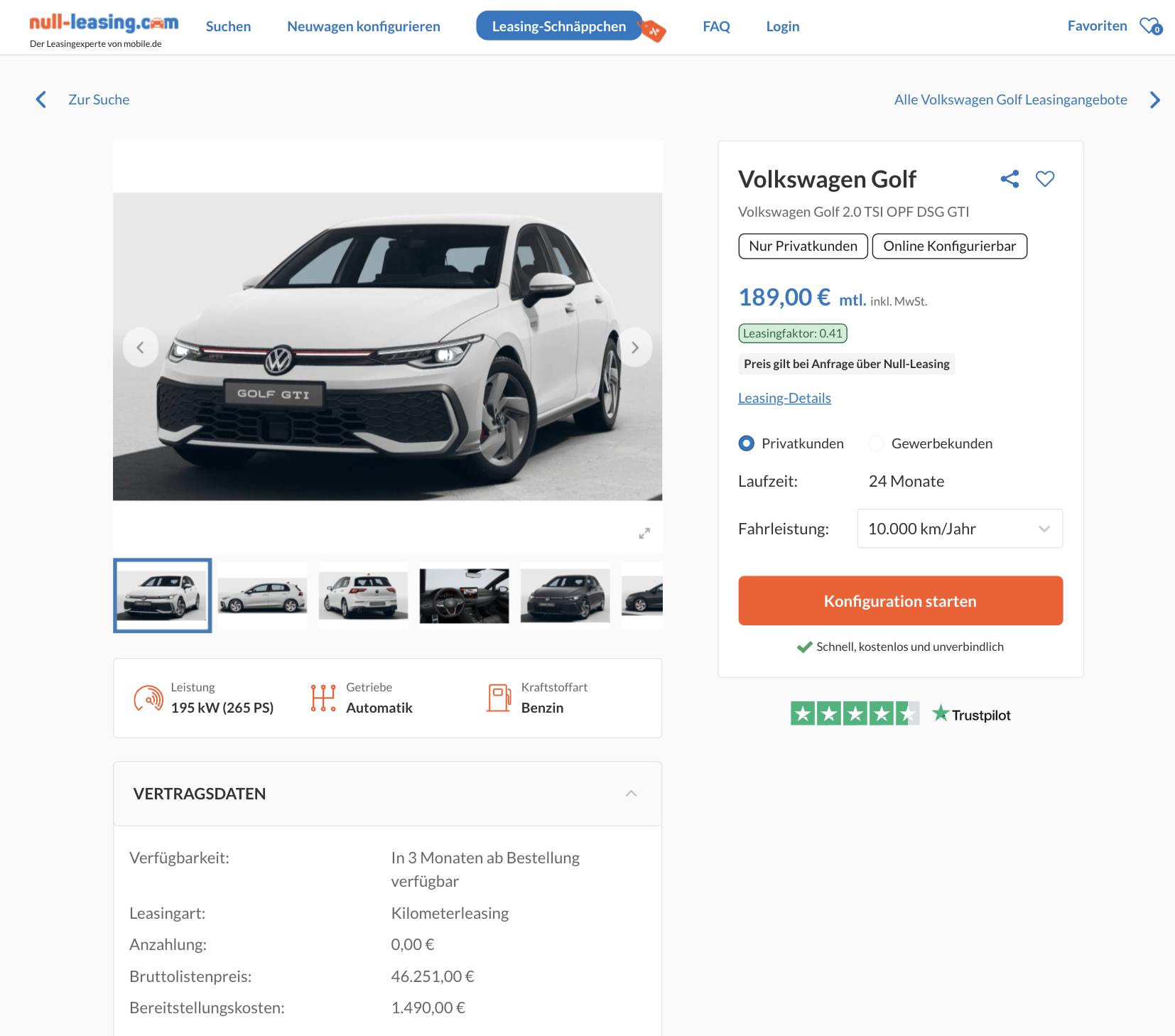 Ein Golf GTI zum Preis, bei dem man nicht nein sagen kann! VW Golf GTI 2.0 TSI OPF DSG bei Null-Leasing fĂŒr 189 Euro brutto im Monat, im Privatleasing, als frei konfigurierbares Bestellfahrzeug. Dazu kommt der Leasingfaktor von 0,41, also ein Wert, der im GTI-Umfeld fast schon frech wirkt. Und der Vergleich macht den Deal erst richtig deutlich, denn der Platzhirsch verlangt aktuell 746 Euro brutto im Monat fĂŒr denselben GTI, damit liegt dieses Angebot bei weniger als einem Drittel, preislich eine komplett andere Welt.