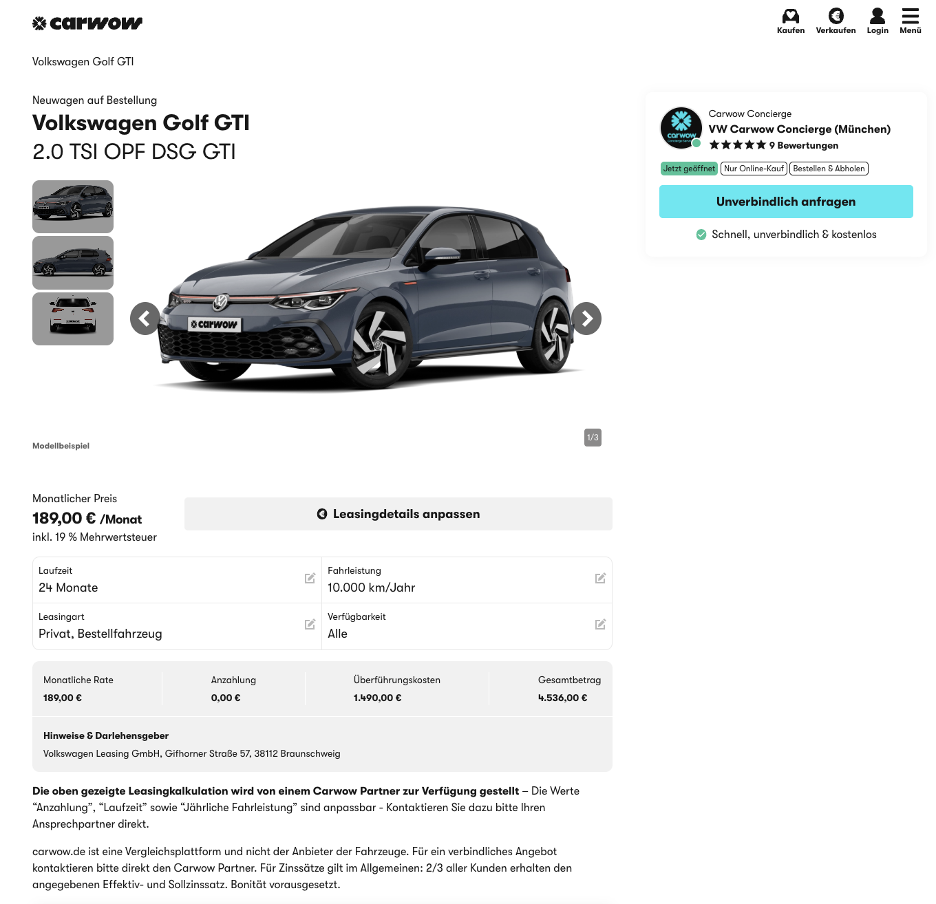 Wenn ein sportlicher Kompaktwagen plötzlich preislich in einer völlig anderen Liga spielt, lohnt sich ein genauer Blick. Der VW Golf GTI 2.0 TSI OPF DSG ist bei carwow fĂŒr 189 Euro brutto pro Monat im Privatleasing erhĂ€ltlich. Das Angebot kommt mit einem Leasingfaktor von 0,41 und richtet sich an alle, die Performance fahren wollen, ohne ein Premiumbudget einzuplanen. Es handelt sich um ein frei konfigurierbares Bestellfahrzeug, Farbe, Felgen und Ausstattung lassen sich also nach eigenen Vorstellungen zusammenstellen.