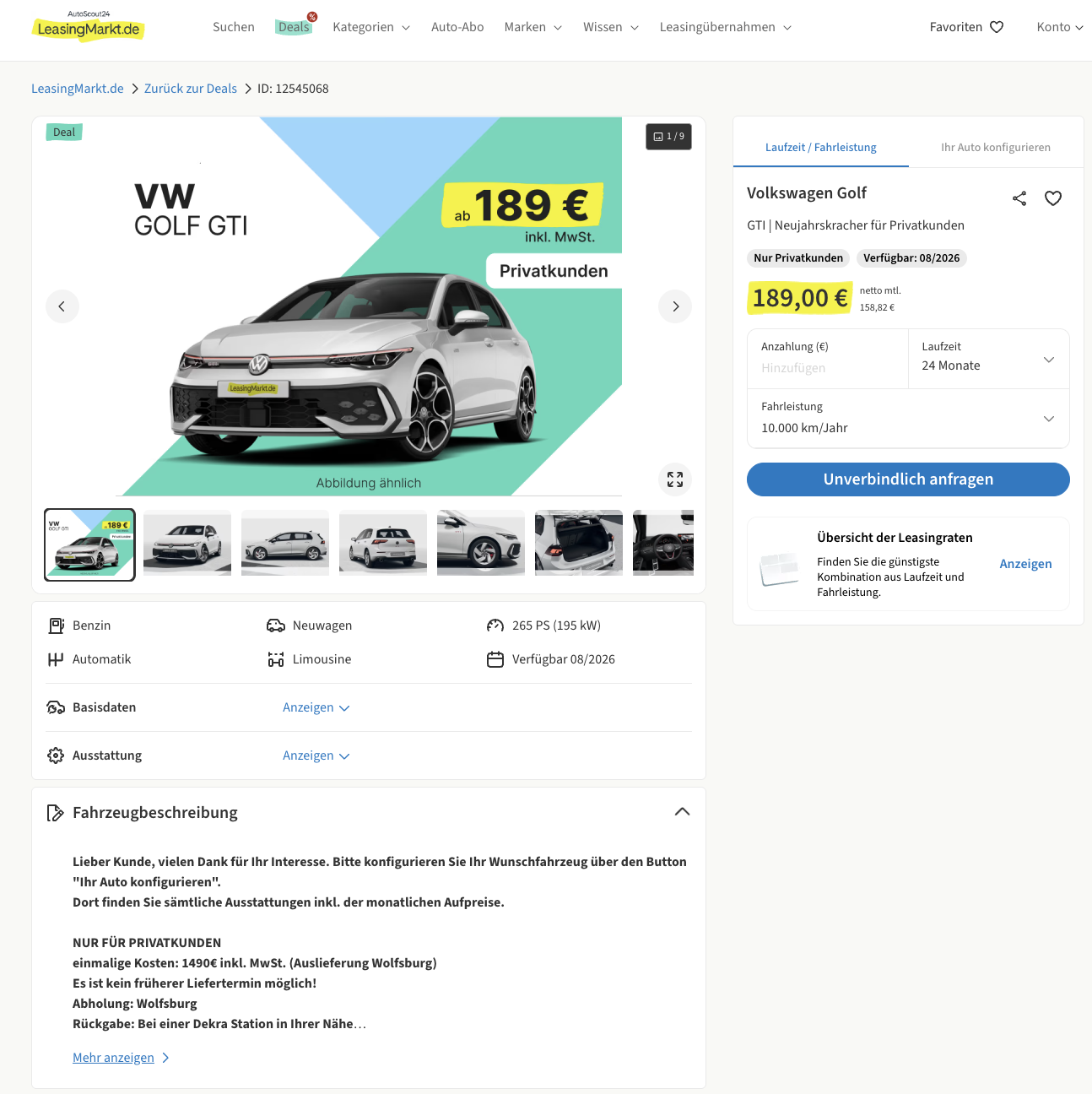Kalkuliert ist das Angebot auf 24 Monate Laufzeit und 10.000 Kilometer pro Jahr, beide Werte lassen sich in der Regel anpassen. Besonders auffällig wird der Deal im direkten Vergleich. Während der Marktführer für einen vergleichbaren VW Golf GTI aktuell rund 623 Euro brutto pro Monat aufruft, liegt dieses Angebot mit 189 Euro brutto in einer völlig anderen Liga.