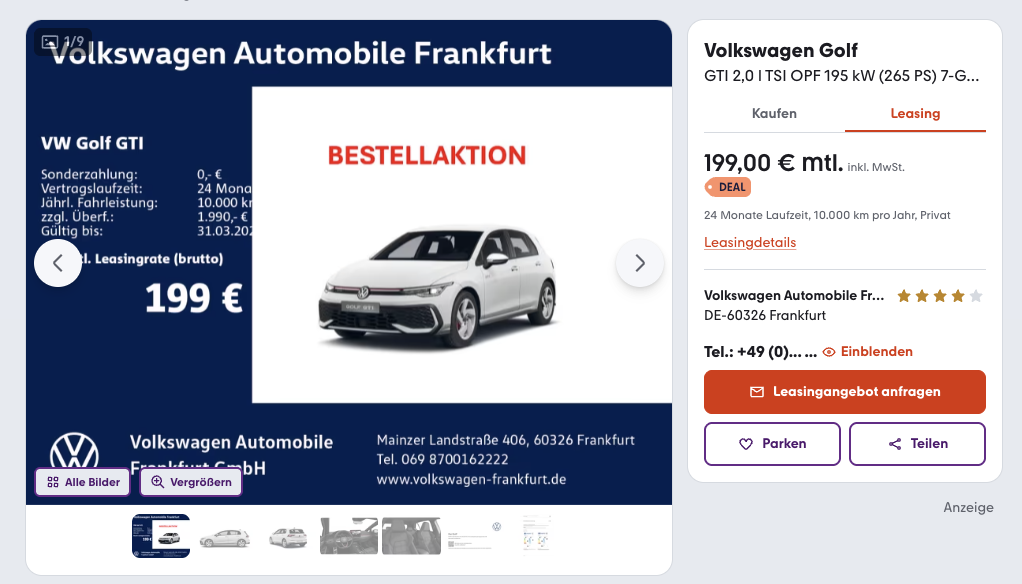 Die Kalkulation basiert auf 24 Monaten Laufzeit und 10.000 Kilometern pro Jahr, Anpassungen sind in der Regel möglich. Besonders interessant wird das Angebot im direkten Marktvergleich. Während der Platzhirsch aktuell rund 623 Euro brutto pro Monat für einen vergleichbaren VW Golf GTI verlangt, bleibt dieses Leasing mit 199 Euro brutto monatlich deutlich darunter. Dadurch entsteht ein Deal, der sportliche Leistung und einen überraschend niedrigen Preis miteinander kombiniert.