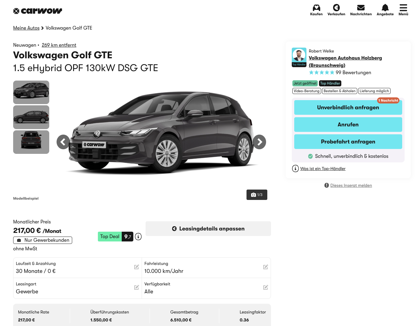 Plug-in-Hybrid mit GTI-DNA und Effizienzfokus. VW Golf GTE 1.5 eHybrid OPF 130 kW DSG bei carwow für 217 Euro netto im Monat bringt genau diese Mischung in ein sofort verfügbares Angebot. Der Lagerwagen steht in Delfingrau Metallic bereit und kann ohne lange Wartezeit übernommen werden.
