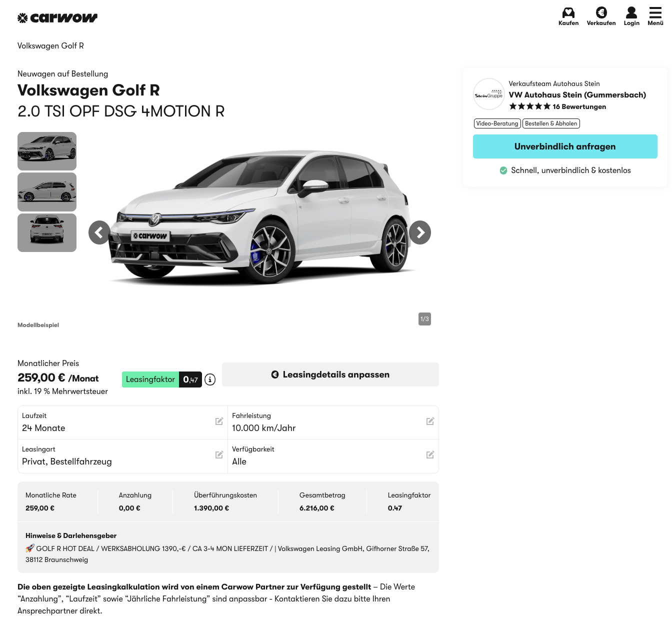 Kalkuliert ist das Angebot auf 24 Monate Laufzeit und 10.000 Kilometer pro Jahr, beides lässt sich in der Regel anpassen. Entscheidend bleibt jedoch die Rate. 259 Euro brutto pro Monat für einen Golf R sind eine klare Ansage. Im direkten Vergleich verlangt der Marktführer aktuell 749 Euro brutto. Damit spielt dieses Angebot preislich in einer komplett anderen Liga und macht den Golf R plötzlich erreichbar für alle, die Performance fahren wollen, ohne in Regionen klassischer Sportwagen vorzustoßen.