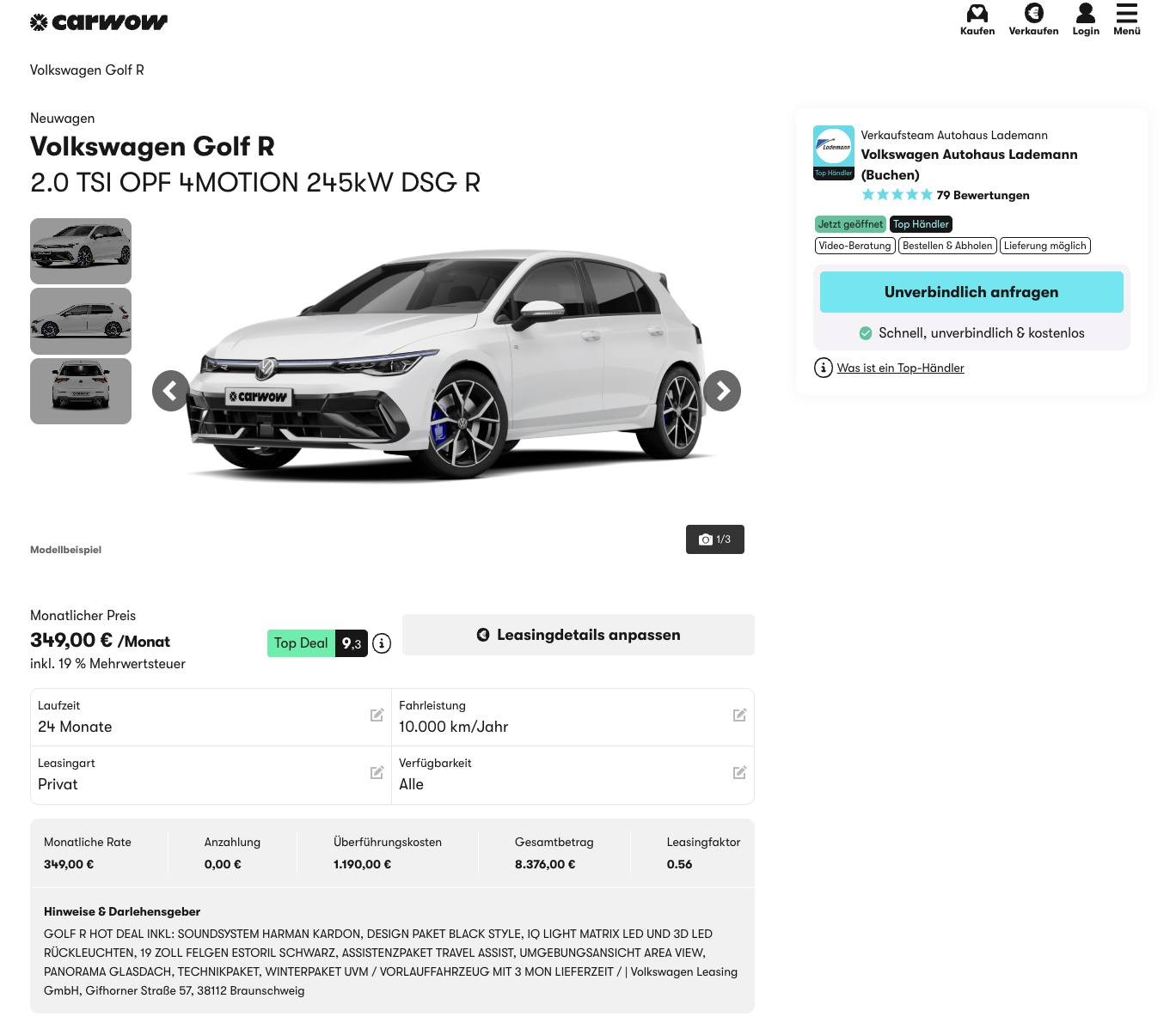 Das Angebot basiert auf 24 Monaten Laufzeit und 10.000 Kilometern pro Jahr, Anpassungen sind meist möglich. Mit 349 Euro brutto pro Monat liegt dieses Leasing deutlich unter vielen vergleichbaren Angeboten. Während Der Platzhirsch für den Golf R rund 821 Euro brutto monatlich verlangt, ergibt sich hier ein besonders großer Preisvorteil.