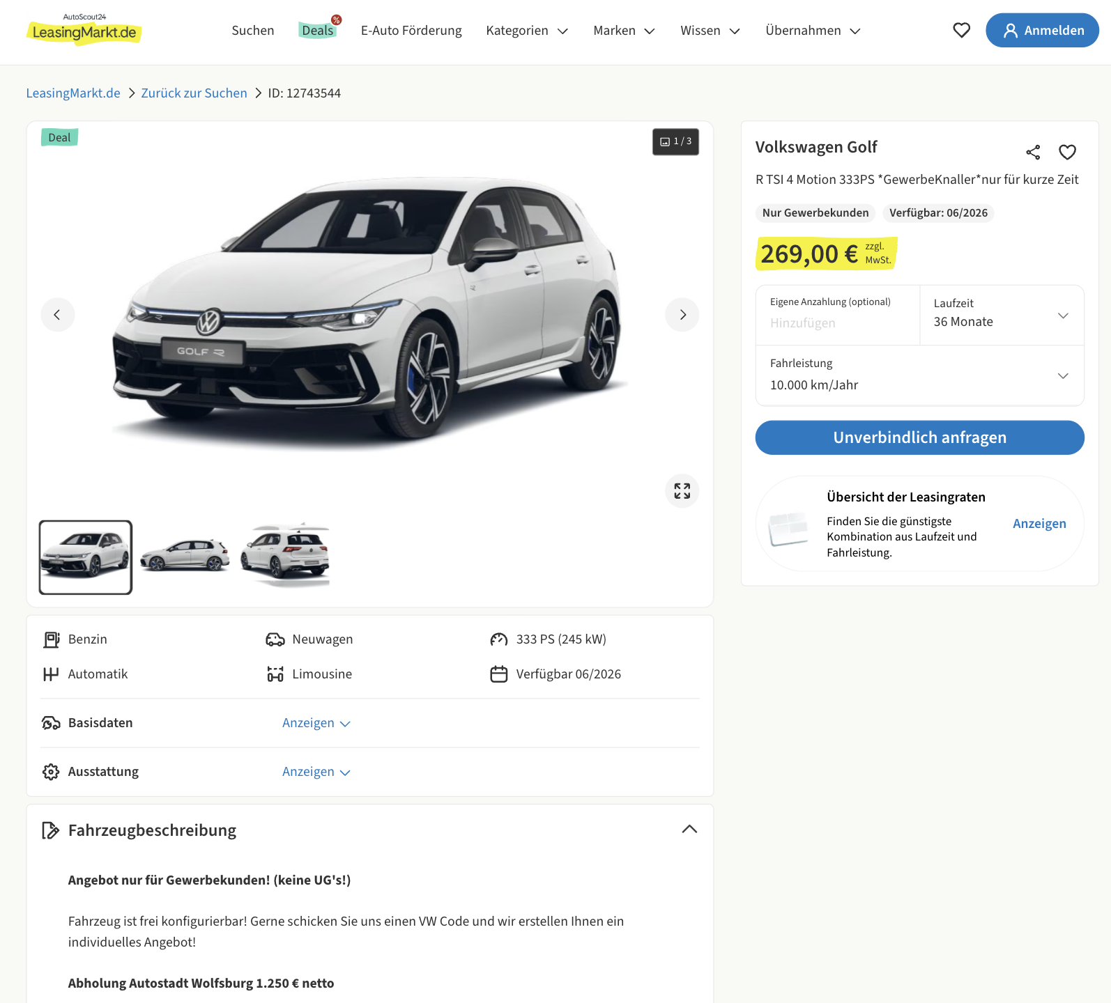 Die Kalkulation basiert auf 36 Monaten Laufzeit und 10.000 Kilometern jährlich. Im direkten Vergleich zeigt sich die Stärke des Angebots besonders deutlich. Während ähnliche Konfigurationen aktuell bei rund 536 Euro netto im Monat liegen, startet dieser Golf R bereits bei 269 Euro netto.
