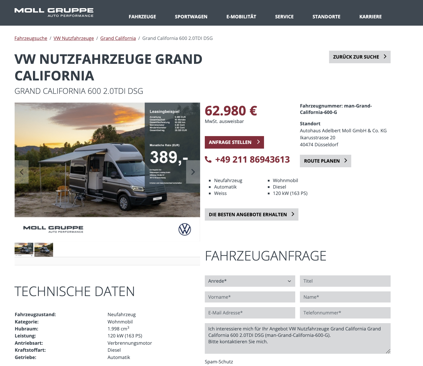 Ein Hotelzimmer auf Rädern, genau dafür wurde der Grand California gebaut. Hier kommt das passende Leasingangebot dazu. Beim Autohaus Moll gibt es den VW Grand California 600 2,0 TDI DSG aktuell für 389 Euro im Monat brutto, bei einer Anzahlung von 5.980 Euro. Daraus ergibt sich eine normalisierte Leasingrate von 488,67 Euro netto. Wer statt Leasing lieber direkt kauft, bekommt den Camper im Barkauf für 62.980 Euro brutto, bei einem UPE von 83.109,60 Euro entspricht das einer Ersparnis von 20.129,60 Euro. Es handelt sich um ein frei konfigurierbares Bestellfahrzeug, Vanlife nach eurem Geschmack, ohne Kompromisse bei Farbe und Ausstattung.