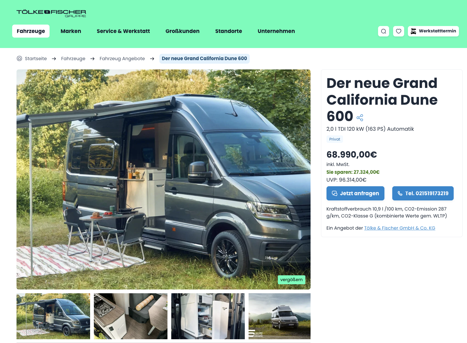 Camping boomt, und genau in diesen Trend passt dieses Angebot perfekt. VW Grand California 600 2.0 TDI SCR 130 kW DSG Dune bei Tölke+Fischer für 68.990 Euro brutto zeigt, dass ein vollwertiges Reisemobil nicht zwangsläufig sechsstellige Beträge kosten muss. Die unverbindliche Preisempfehlung liegt bei 96.314 Euro, wodurch sich eine Ersparnis von 27.324 Euro beziehungsweise rund 30 Prozent ergibt. In dieser Fahrzeugklasse ist ein solcher Preisnachlass alles andere als selbstverständlich.