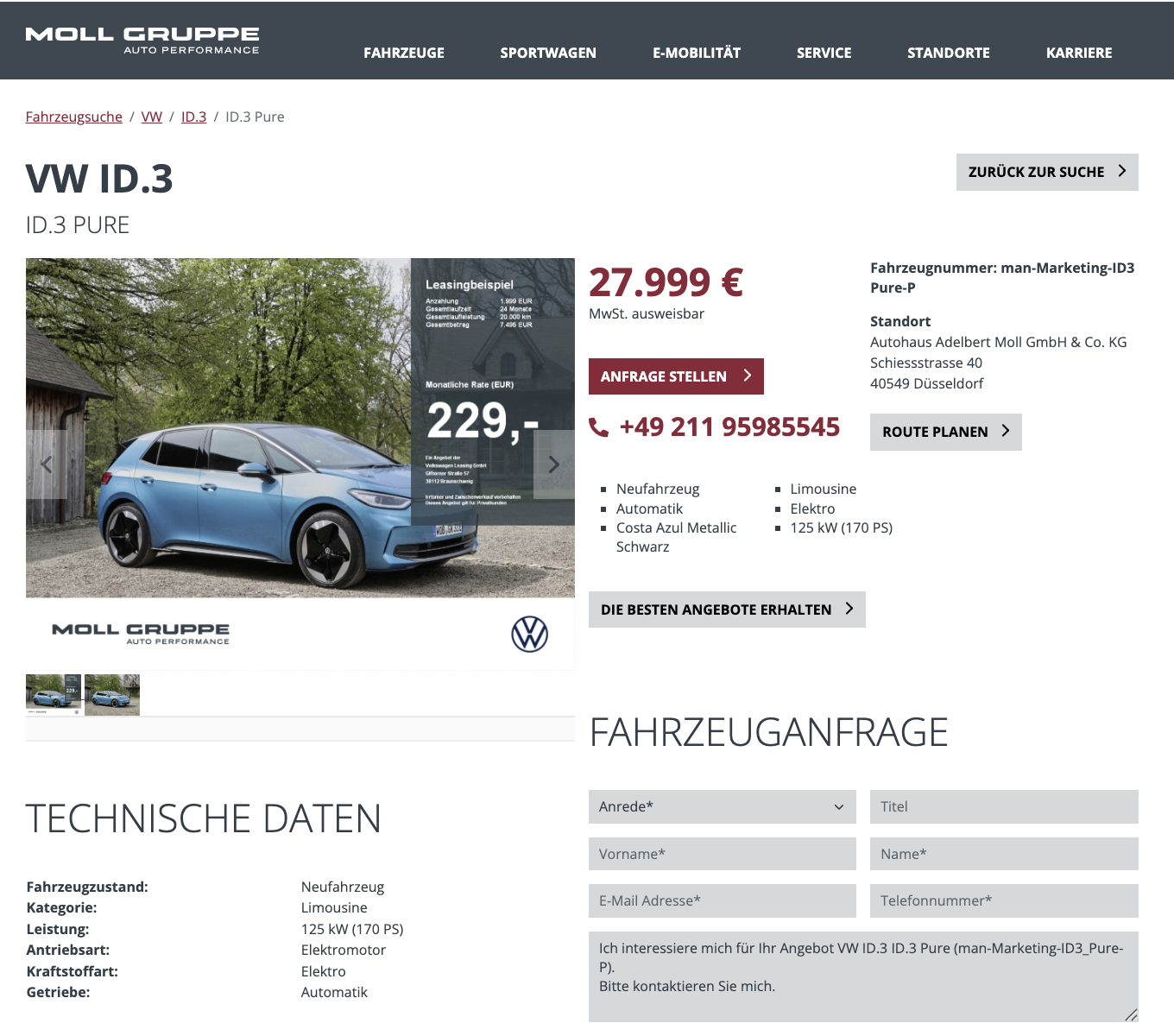 Den VW ID.3 52 kWh 125 kW Pure gibt es im Moment beim Autohaus Moll für 229 Euro brutto pro Monat, kalkuliert mit einer Anzahlung von 1.999 Euro inklusive Werkabholung, 24 Monaten Laufzeit, 10.000 Freikilometer pro Monat und einem Leasingfaktor von 0,94. Es ist eine Bestellaktion, ID.3 wird also individuell konfiguriert, von der Lackierung bis zu ausgewählten Ausstattungspaketen.