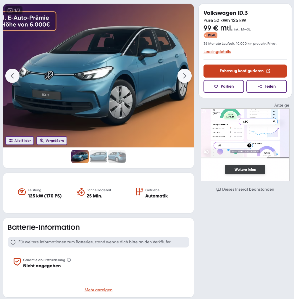 Er ist das kompakte Elektroauto im Volkswagen-Portfolio und steht fĂŒr den unkomplizierten Umstieg auf Strom. Privatkunden können den VW ID.3 52 kWh 125 kW Pure bei mobile.de fĂŒr 99 Euro brutto im Monat leasen, kalkuliert mit 6.000 Euro Sonderzahlung im Rahmen der aktuellen E-Fahrzeug-PrĂ€mie. Das Angebot lĂ€uft ĂŒber 36 Monate bei 10.000 Kilometern jĂ€hrlich und richtet sich an alle, die einen modernen Elektro Volkswagen mit ĂŒberschaubarer Lieferzeit suchen. Als frei konfigurierbares Bestellfahrzeug lĂ€sst sich der ID.3 individuell zusammenstellen, die Auslieferung erfolgt nach rund fĂŒnf Monaten.